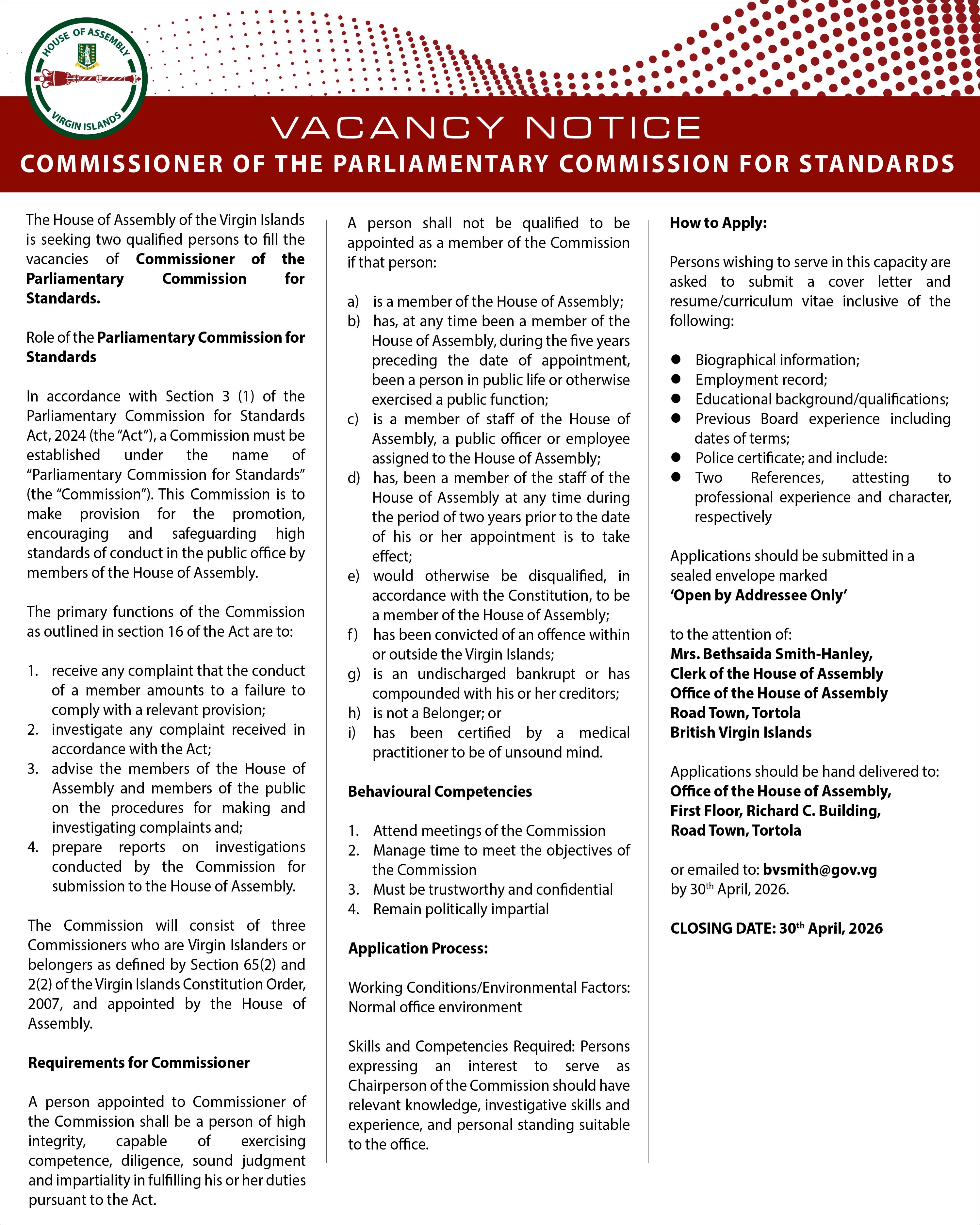 Office of the House of Assembly Management Commission, First Floor, Richard C. Building, Road Town, Tortola or emailed to bvsmith@gov.vg by 30th April, 2026.