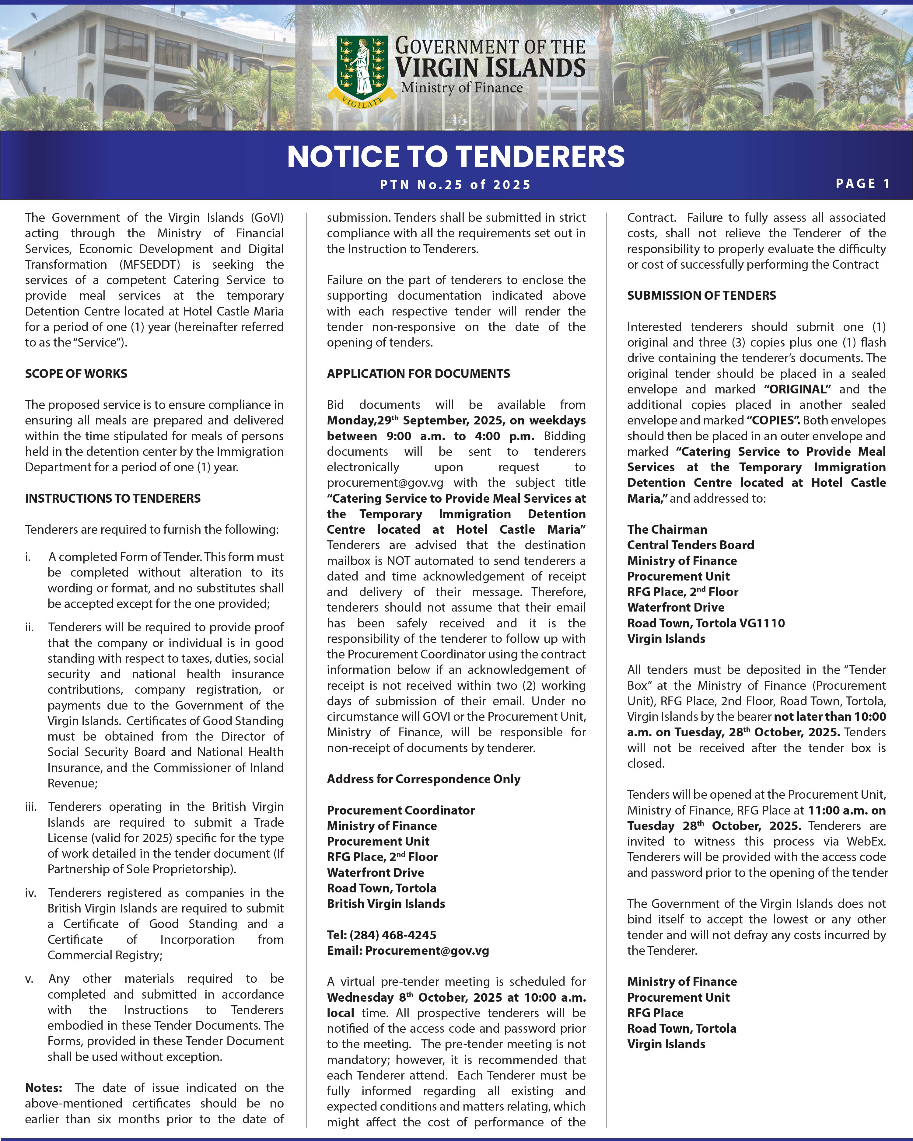 Interested persons should address applications to Procurement Coordinator Ministry of Finance Procurement Unit RFG Place, 2nd Floor Waterfront Drive Road Town, Tortola British Virgin Islands Tel: (284) 468-4245 Email: Procurement@gov.vg
