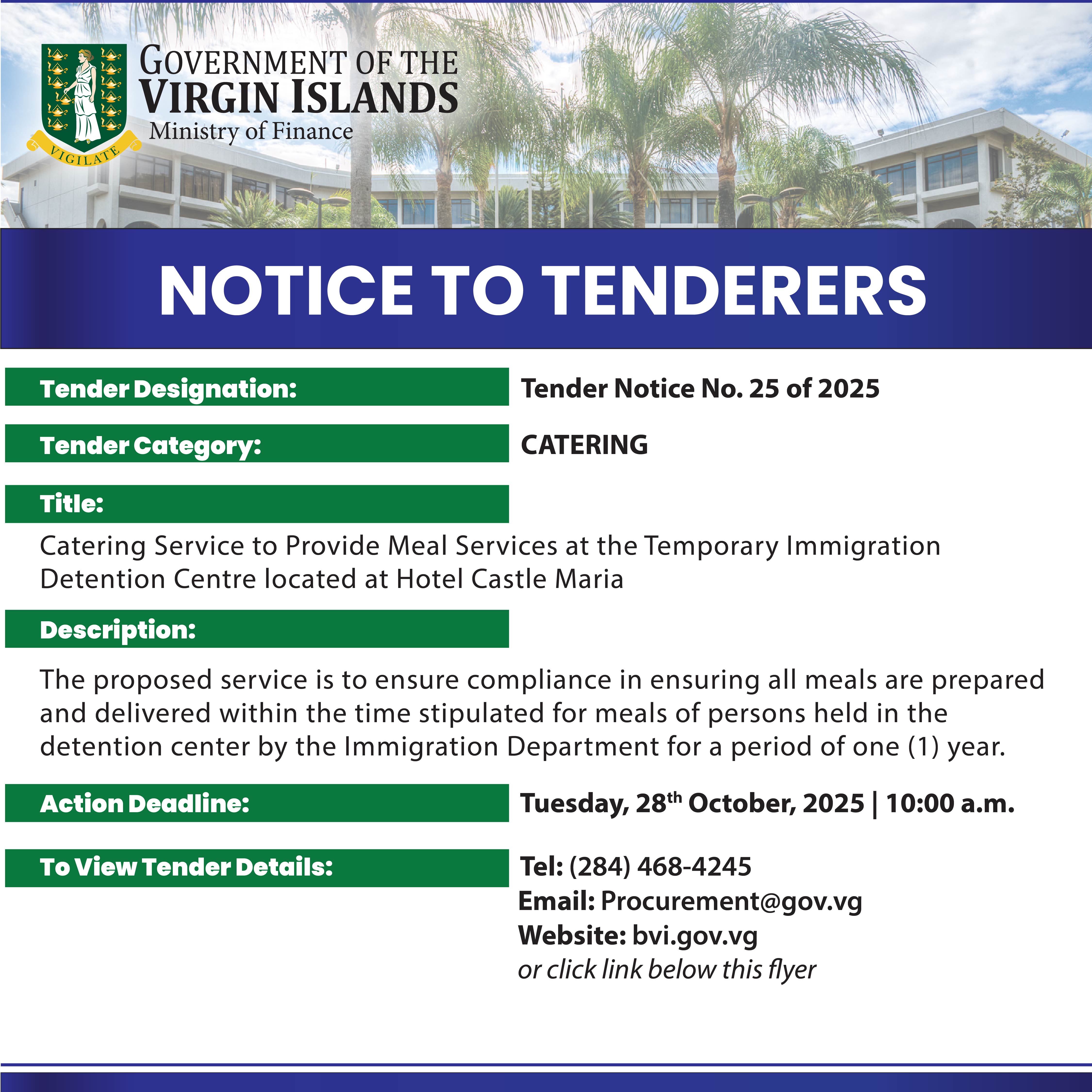 Bid documents will be available from Monday, 29th September, 2025, on weekdays between 9:00 am to 4:00 pm. Bidding documents will be sent to tenderers electronically upon request to procurement@gov.vg with the subject title “Catering Service to Provide Meal Services at the Temporary Immigration Detention Centre located at Hotel Castle Maria”