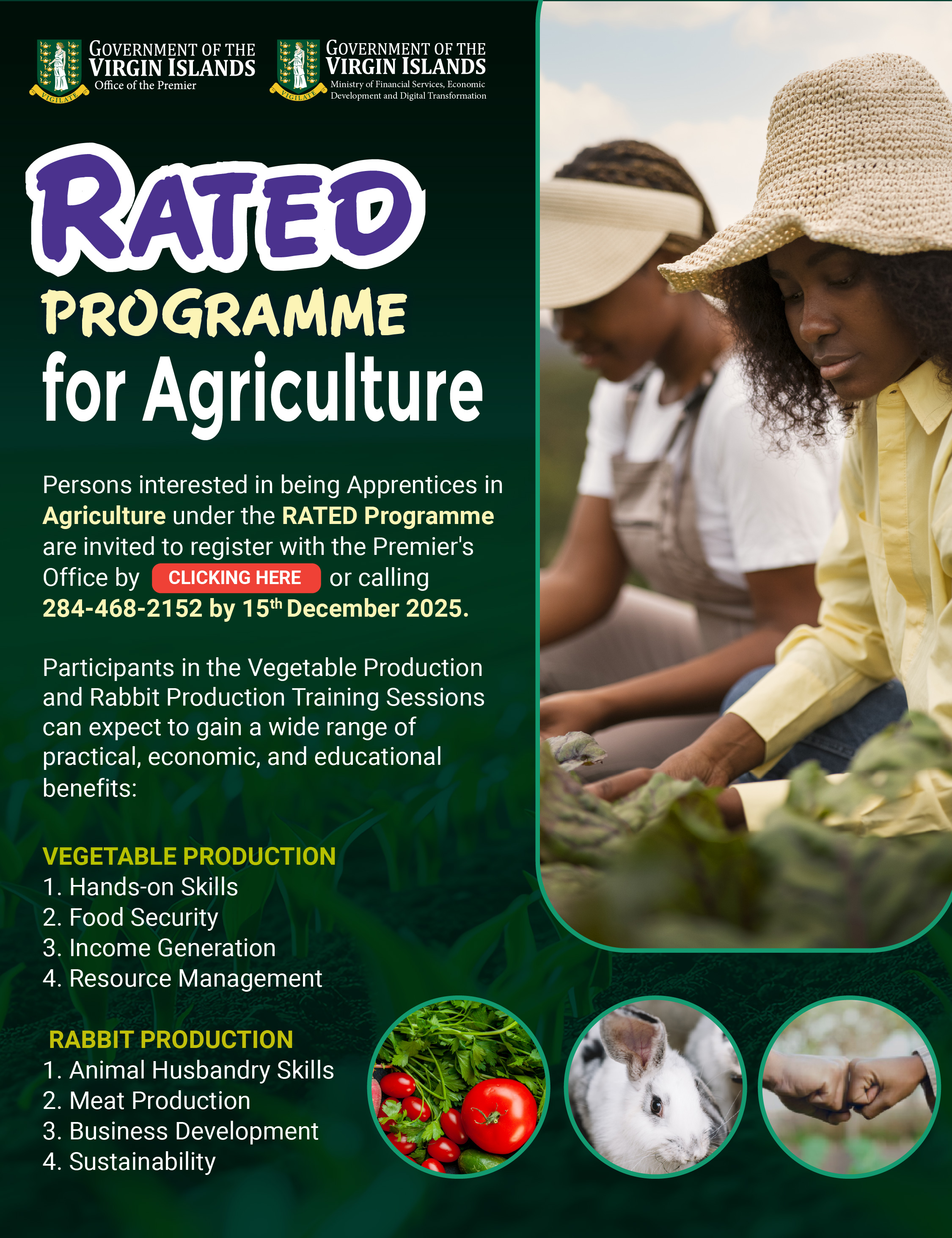 Persons interested in being Apprentices in Agriculture under the RATED Programme are invited to register with the Premier's Office by or calling 284-468-2152 by 15th December 2025.