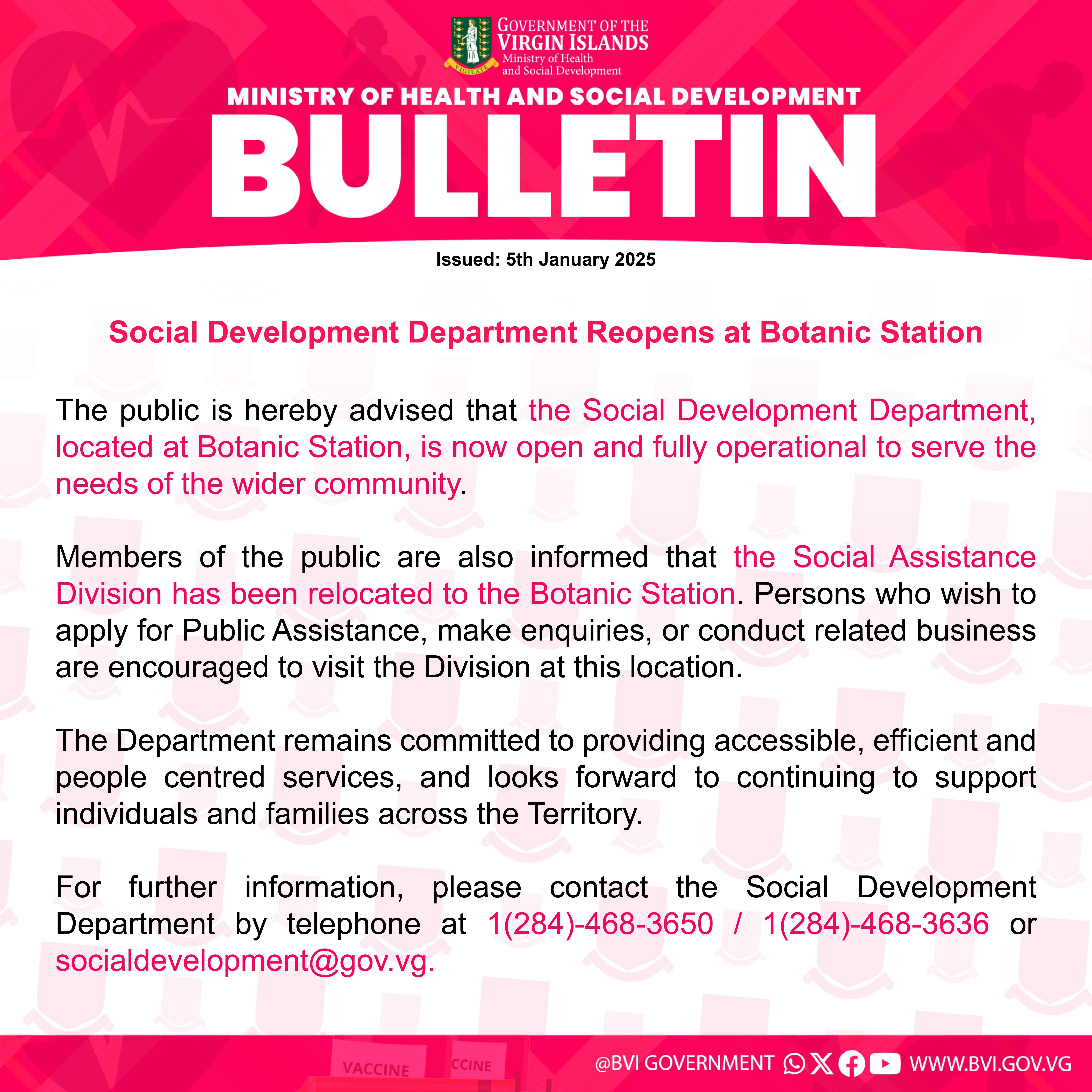 Members of the public are also informed that the Social Assistance Division has been relocated to the Botanic Station. Persons who wish to apply for Public Assistance, make enquiries, or conduct related business are encouraged to visit the Division at this location.
