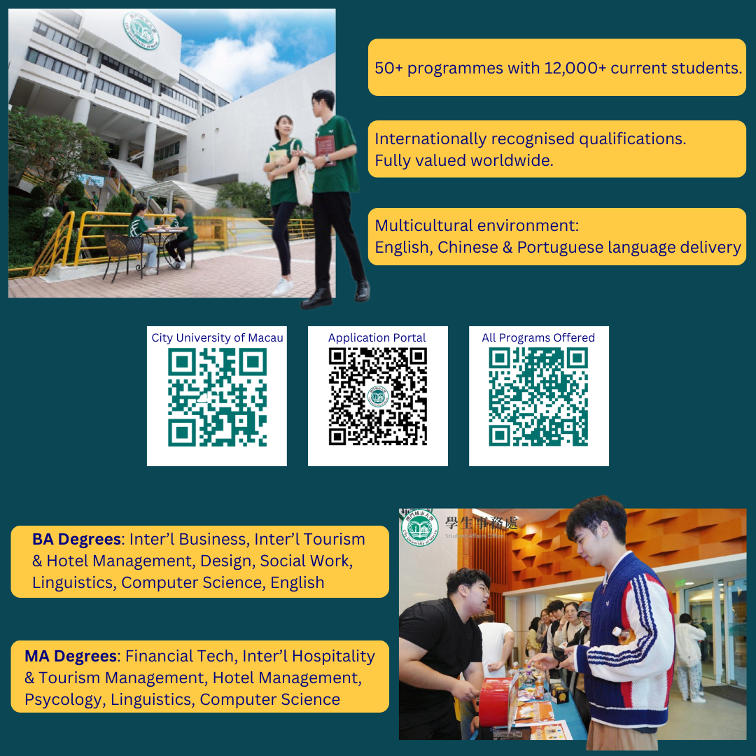 City University of Macau offers over 50 academic programmes designed to prepare students for global careers. With internationally recognised qualifications and a multicultural learning environment, students benefit from instruction in English, Chinese, and Portuguese.