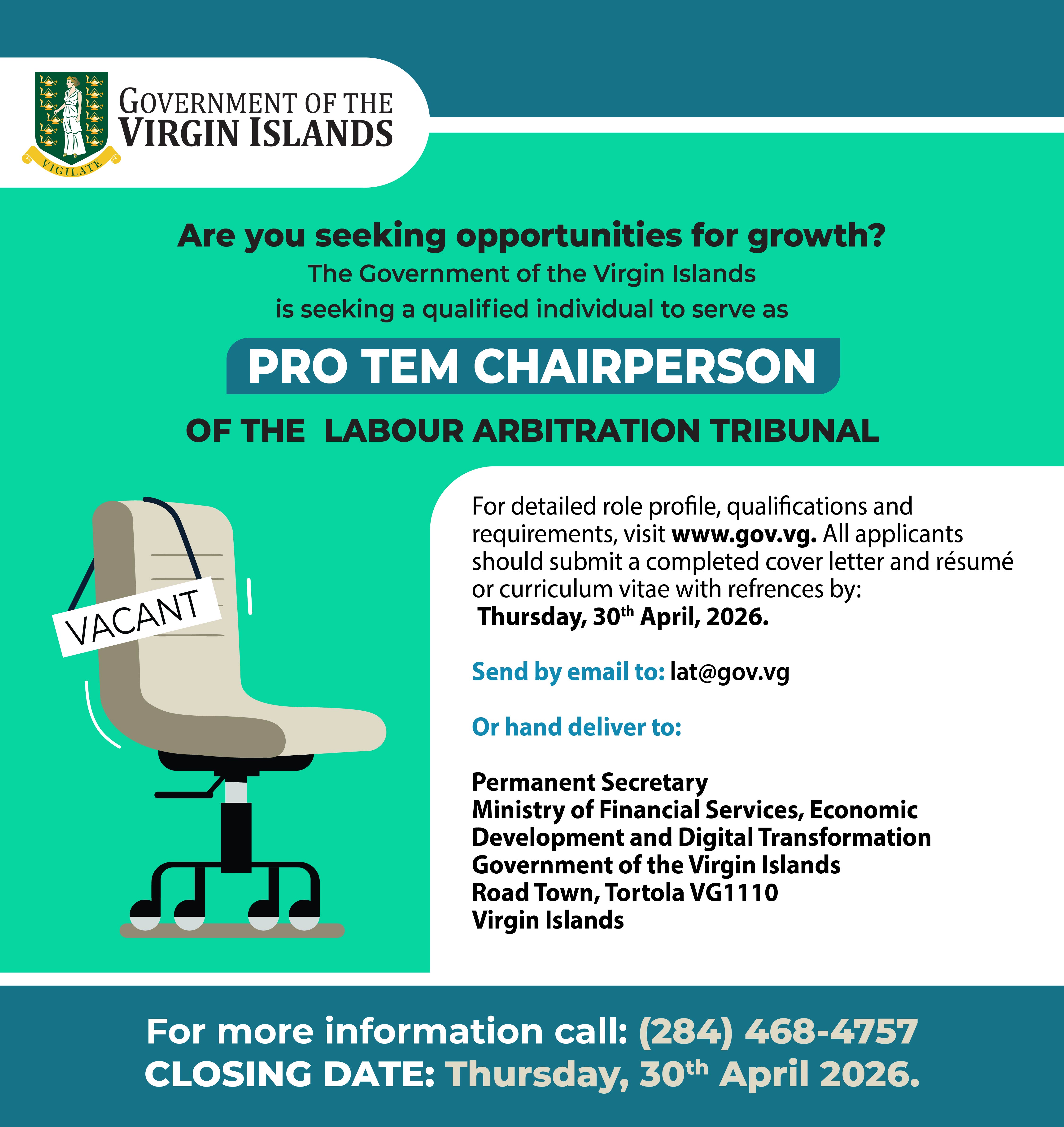 The Government of the Virgin Islands invites applications from suitably qualified and experienced legal professionals for the position of Pro Tem Chairperson of the Labour Arbitration Tribunal.