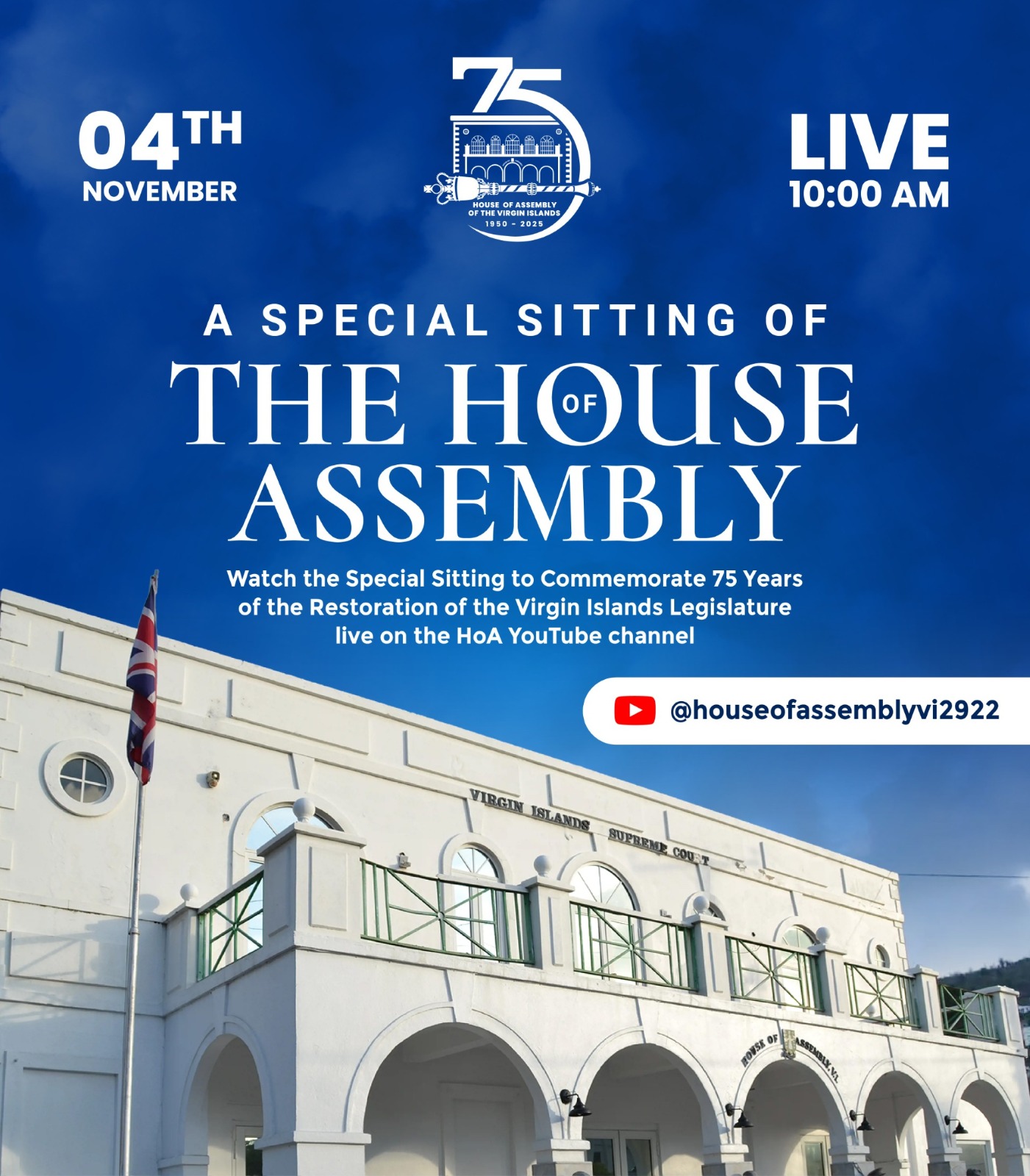 The public is invited to join a Special Sitting of the Eleventh Sitting of the Second Session of the Fifth House of Assembly, where members will share meaningful reflections on the significance of the Virgin Islands celebrating 75 years of the restoration of its legislature.