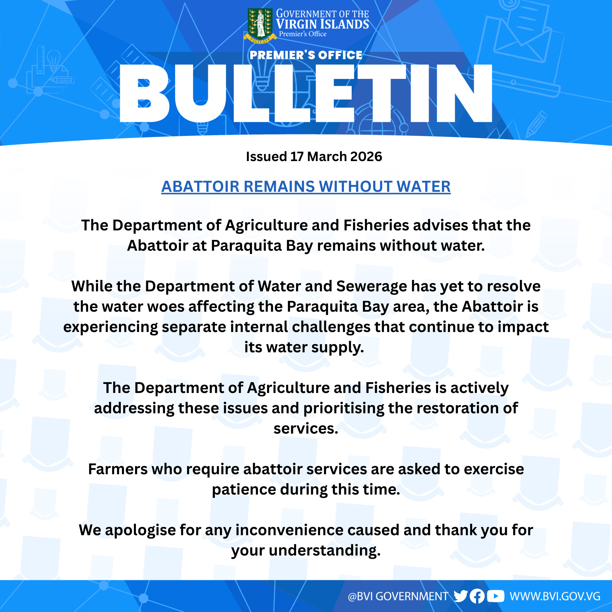 While the Department of Water and Sewerage has yet to resolve the water woes affecting the Paraquita Bay area, the Abattoir is experiencing separate internal challenges that continue to impact its water supply. The Department of Agriculture and Fisheries is actively addressing these issues and prioritising the restoration of services.