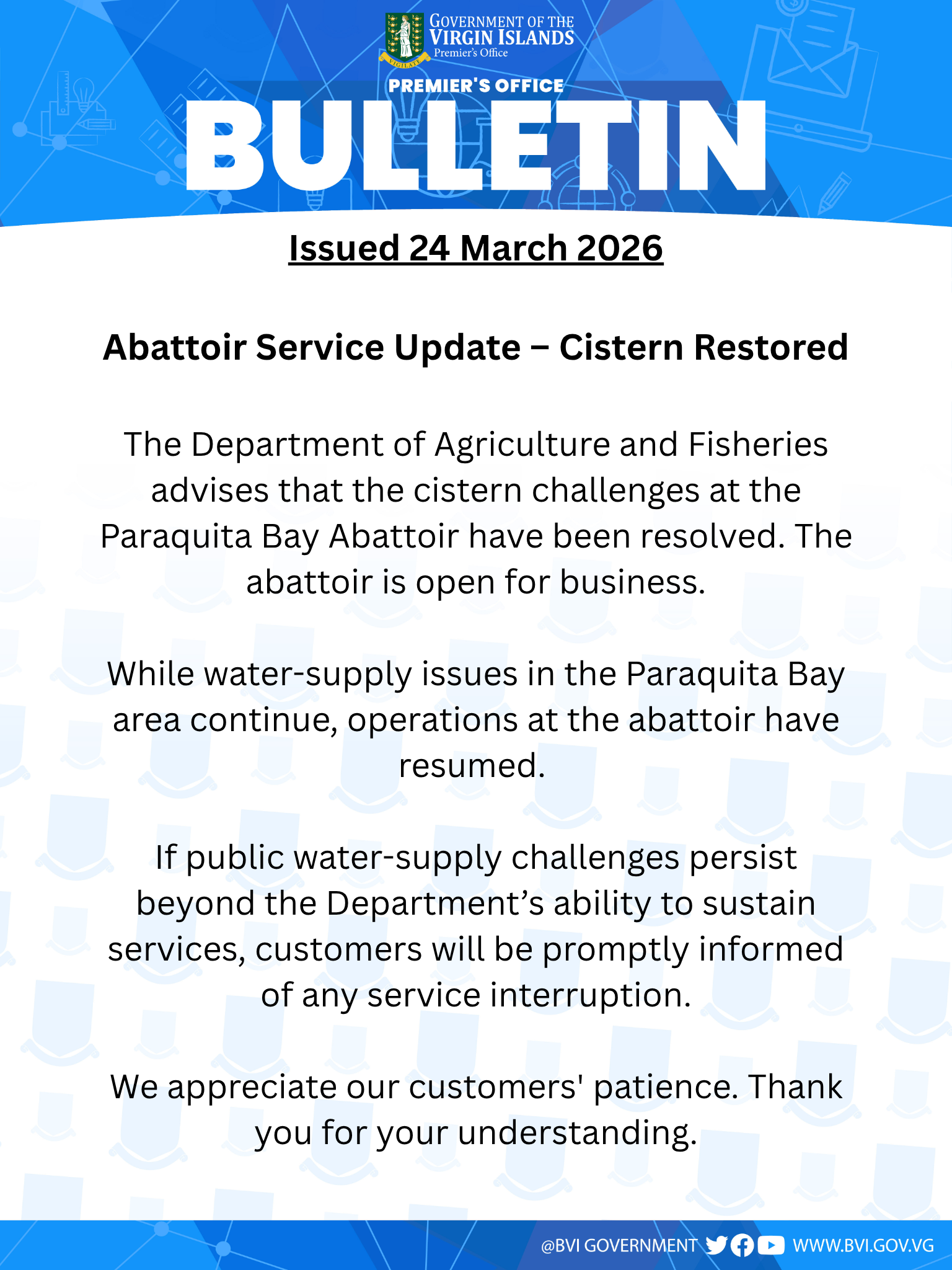 The Department of Agriculture and Fisheries advises that the cistern challenges at the Paraquita Bay Abattoir have been resolved. The abattoir is open for business.