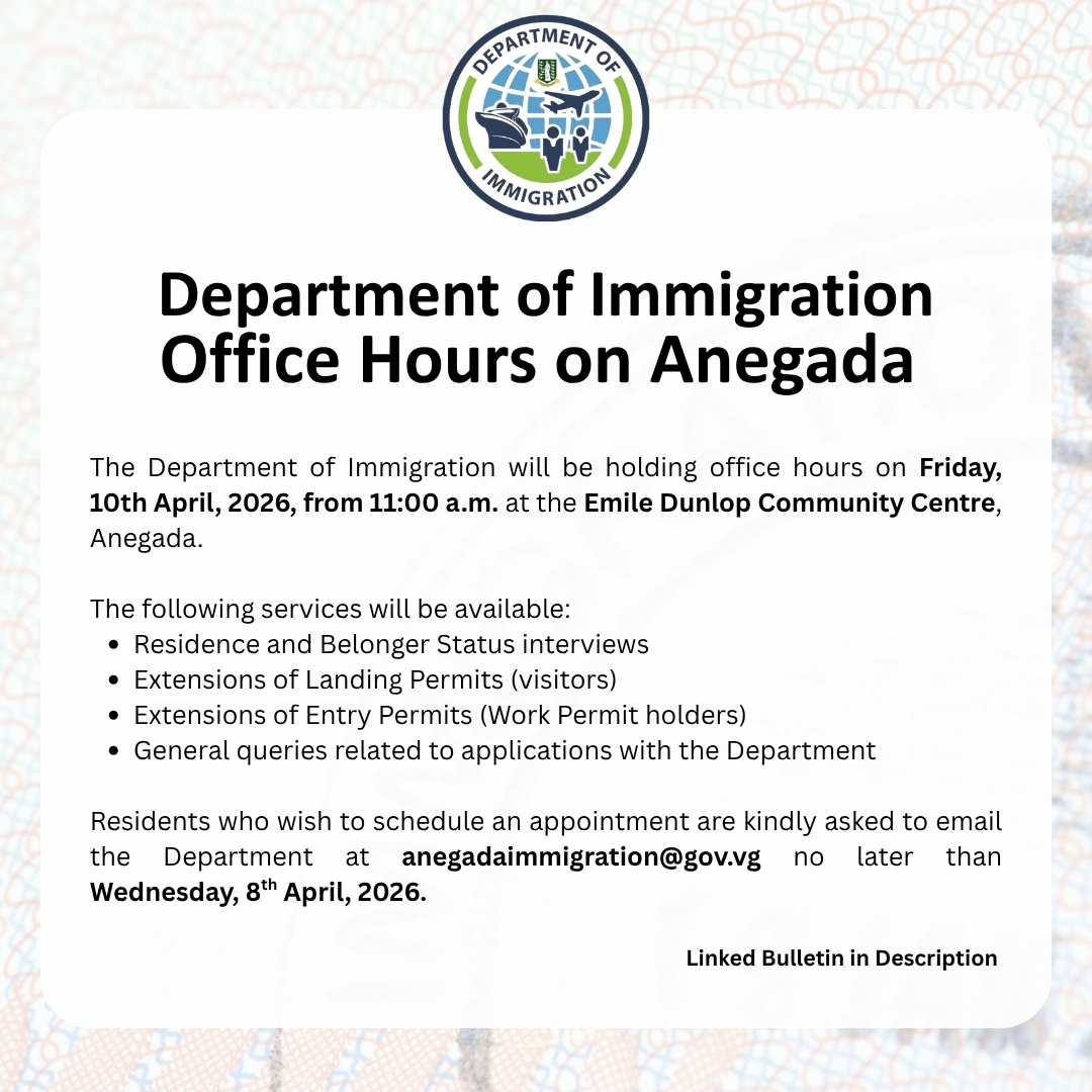 Residents who wish to schedule an appointment are kindly asked to email the Department at anegadaimmigration@gov.vg no later than Wednesday, 8th April, 2026.