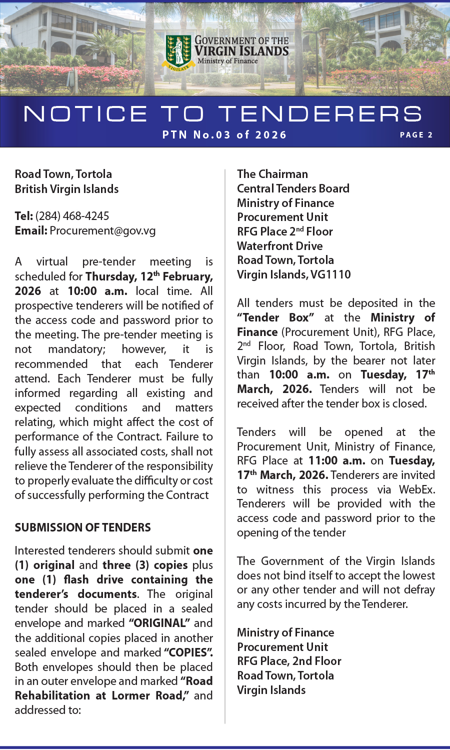 The Government of the Virgin Islands invites tenders for the execution of road rehabilitation works at Lomer Bay, Tortola.