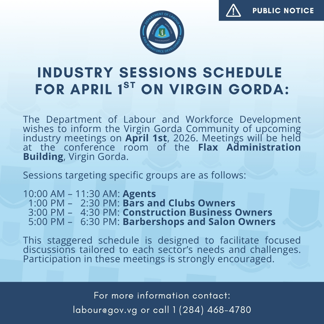 The Department of Labour and Workforce Development will be hosting multiple industry meetings on Virgin Gorda on Wednesday, April 1, 2026, as part of its continued commitment to fostering stronger collaboration and engagement with stakeholders across the Territory.