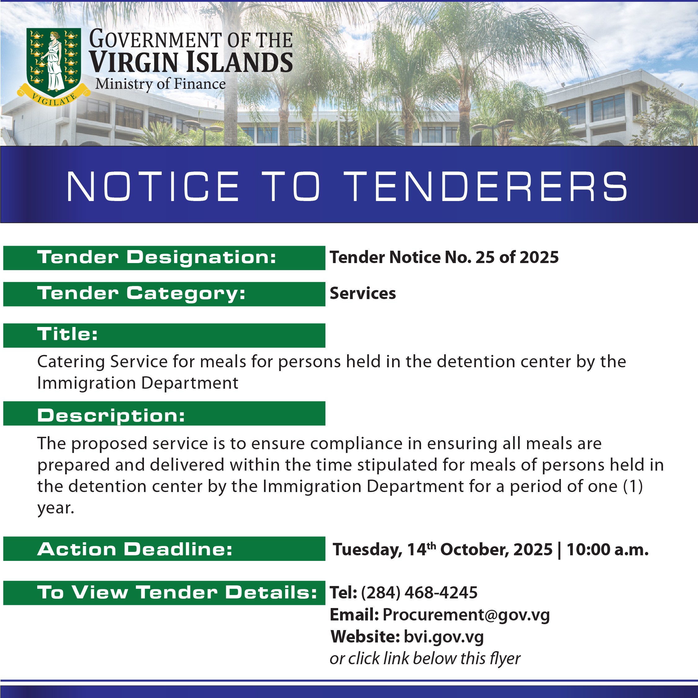 Bid documents will be available from Monday,15th September, 2025, on weekdays between 9:00 am to 4:00 pm. Bidding documents will be sent to tenderers electronically upon request to procurement@gov.vg with the subject title “Catering Service to Provide Meal Services at the Temporary Immigration Detention Centre located at Hotel Castle Maria”