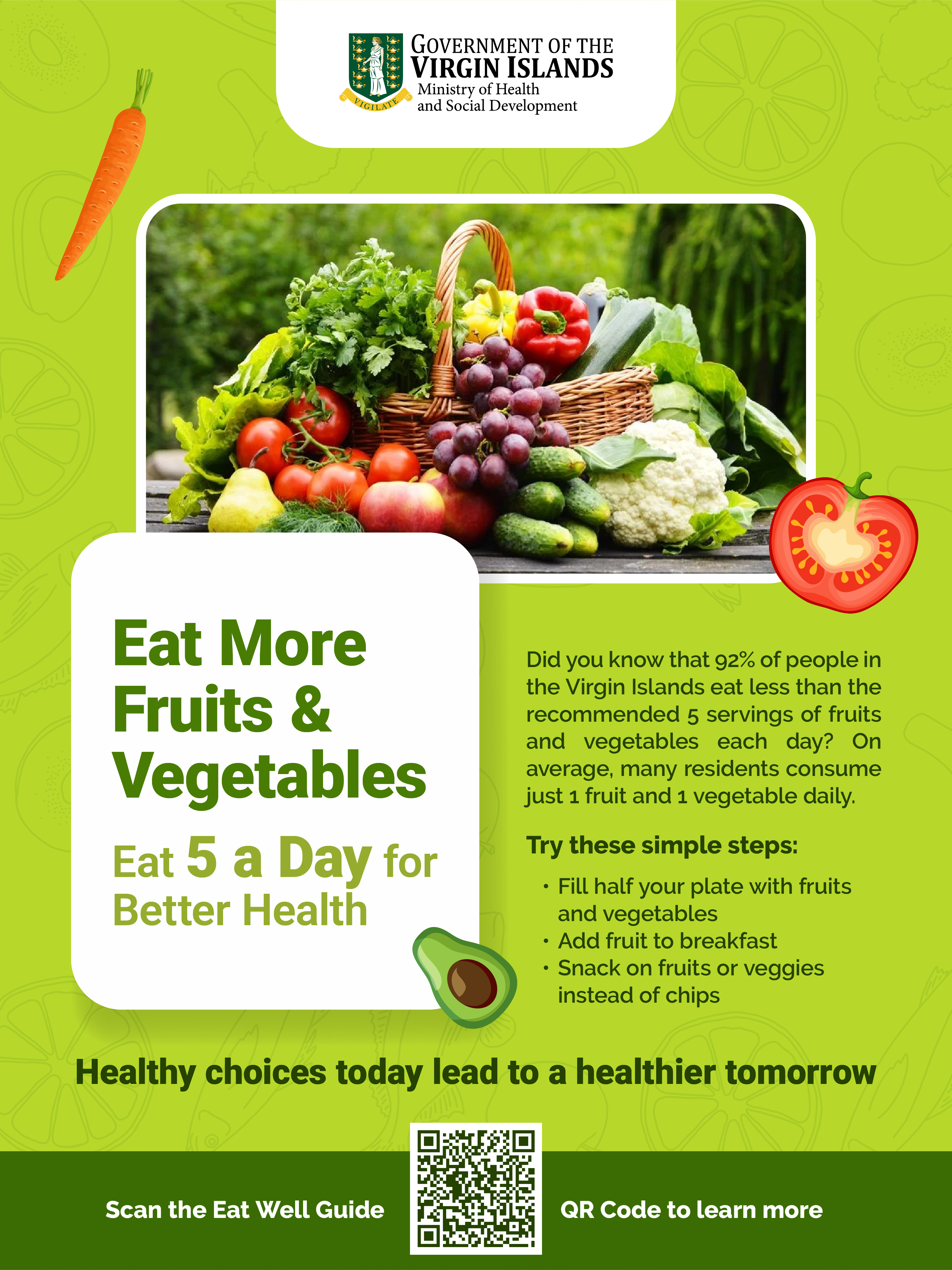 “Data shows that approximately 92% of the population in the Virgin Islands consume less than the recommended five servings of fruits and vegetables each day, with many persons averaging only one fruit and one vegetable daily. Increasing fruit and vegetable intake is one of the simplest and most effective ways to improve health,” Ms. Maduro explained.
