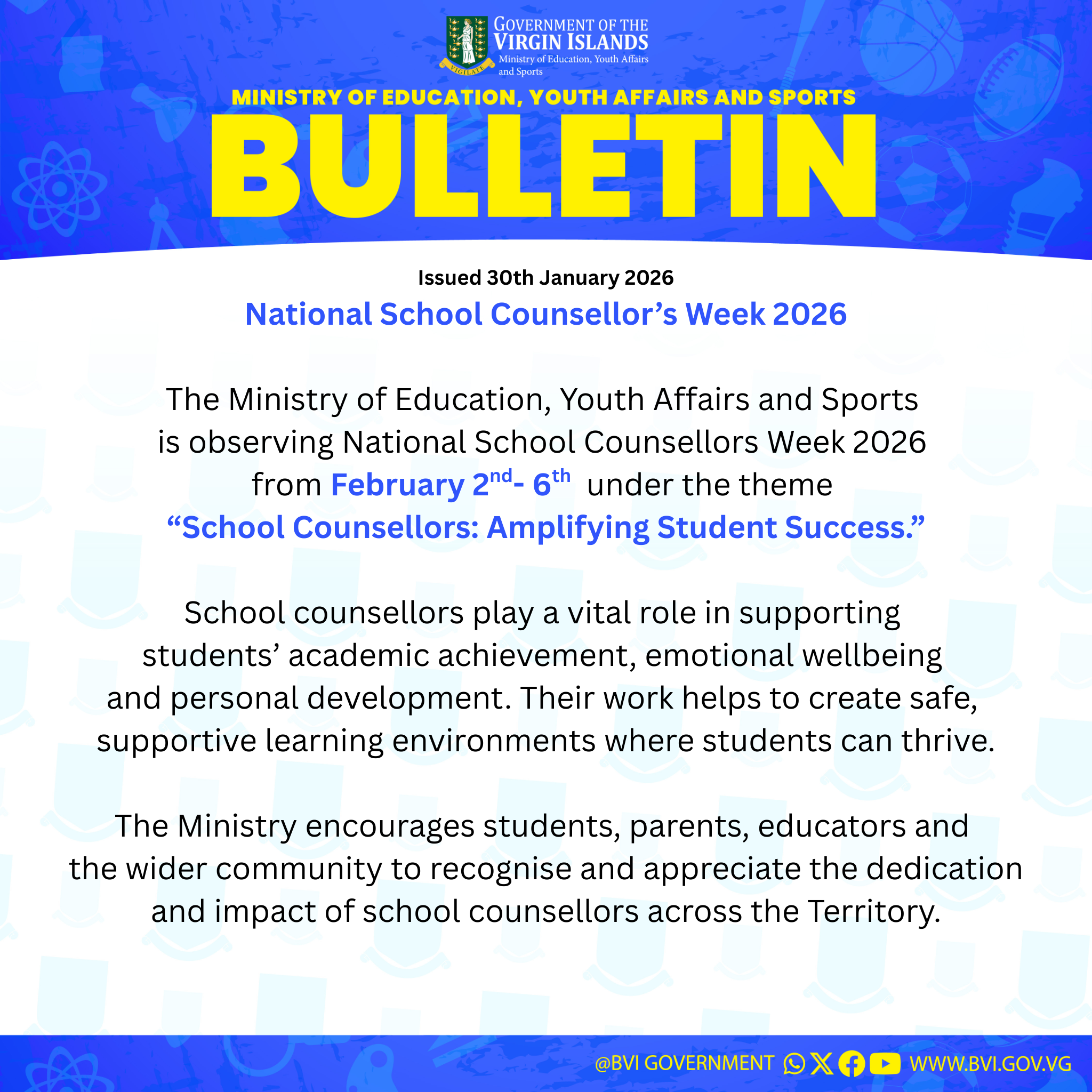 The Ministry of Education, Youth Affairs and Sports is observing National School Counsellors Week 2026 from February 2nd- 6th under the theme “School Counsellors: Amplifying Student Success.”