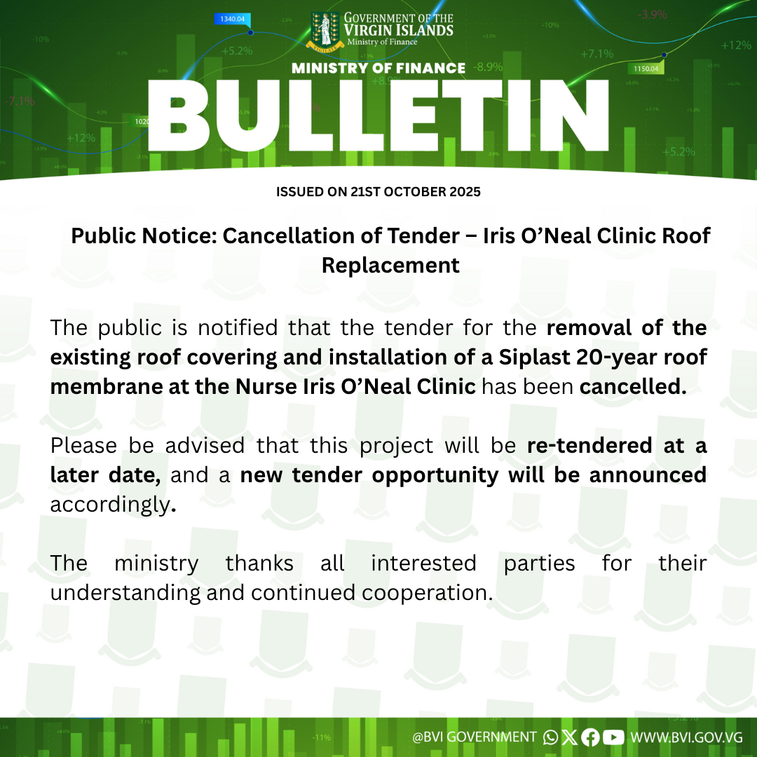 The public is notified that the tender for the removal of the existing roof covering and installation of a Siplast 20-year roof membrane at the Nurse Iris O’Neal Clinic has been cancelled.