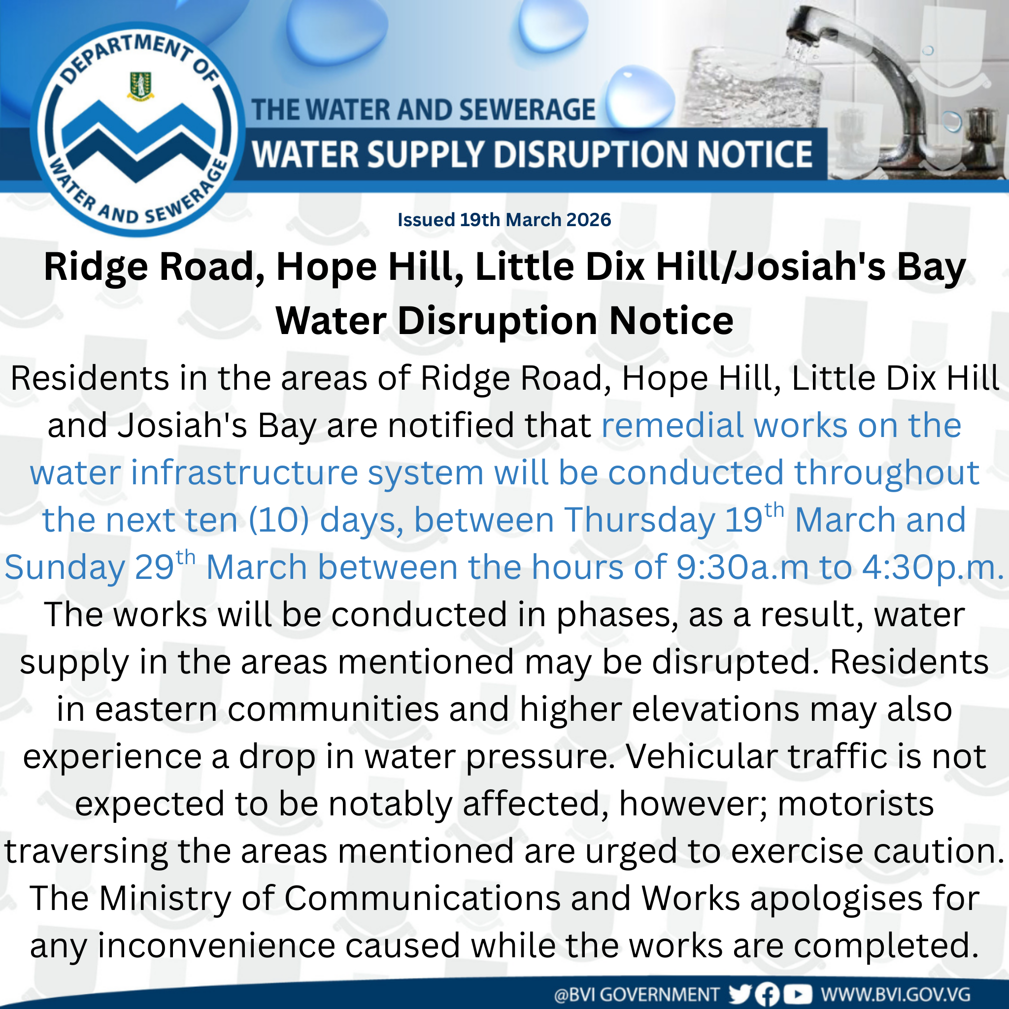 Residents in the areas of Ridge Road, Hope Hill, Little Dix Hill and Josiah's Bay are notified that remedial works on the water infrastructure system will be conducted throughout the next ten (10) days, between Thursday 19th March and Sunday 29th March between the hours of 9:30a.m to 4:30p.m.
