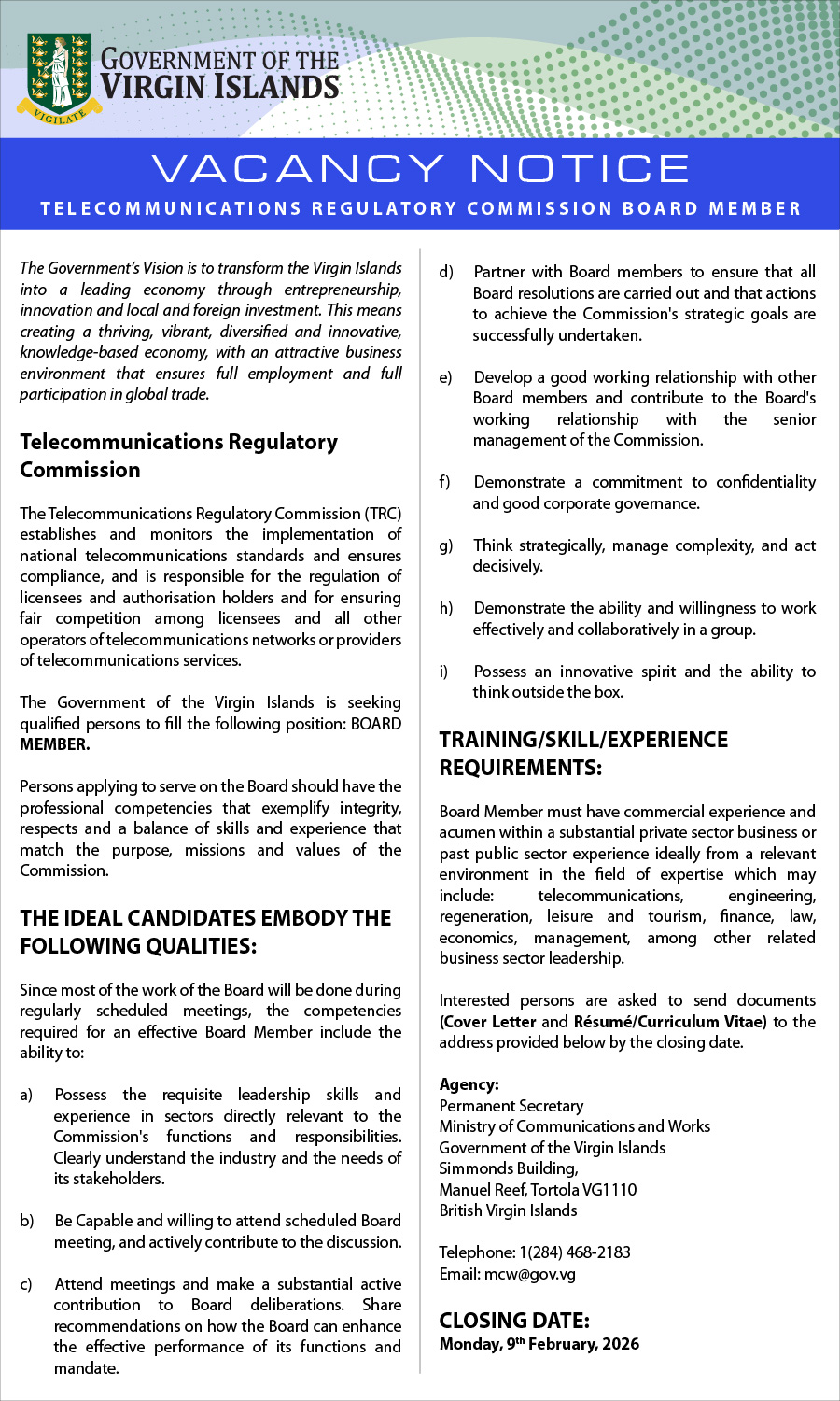 The Government of the Virgin Islands is seeking qualified persons to fill the following positions: Board Member/Commissioner.
