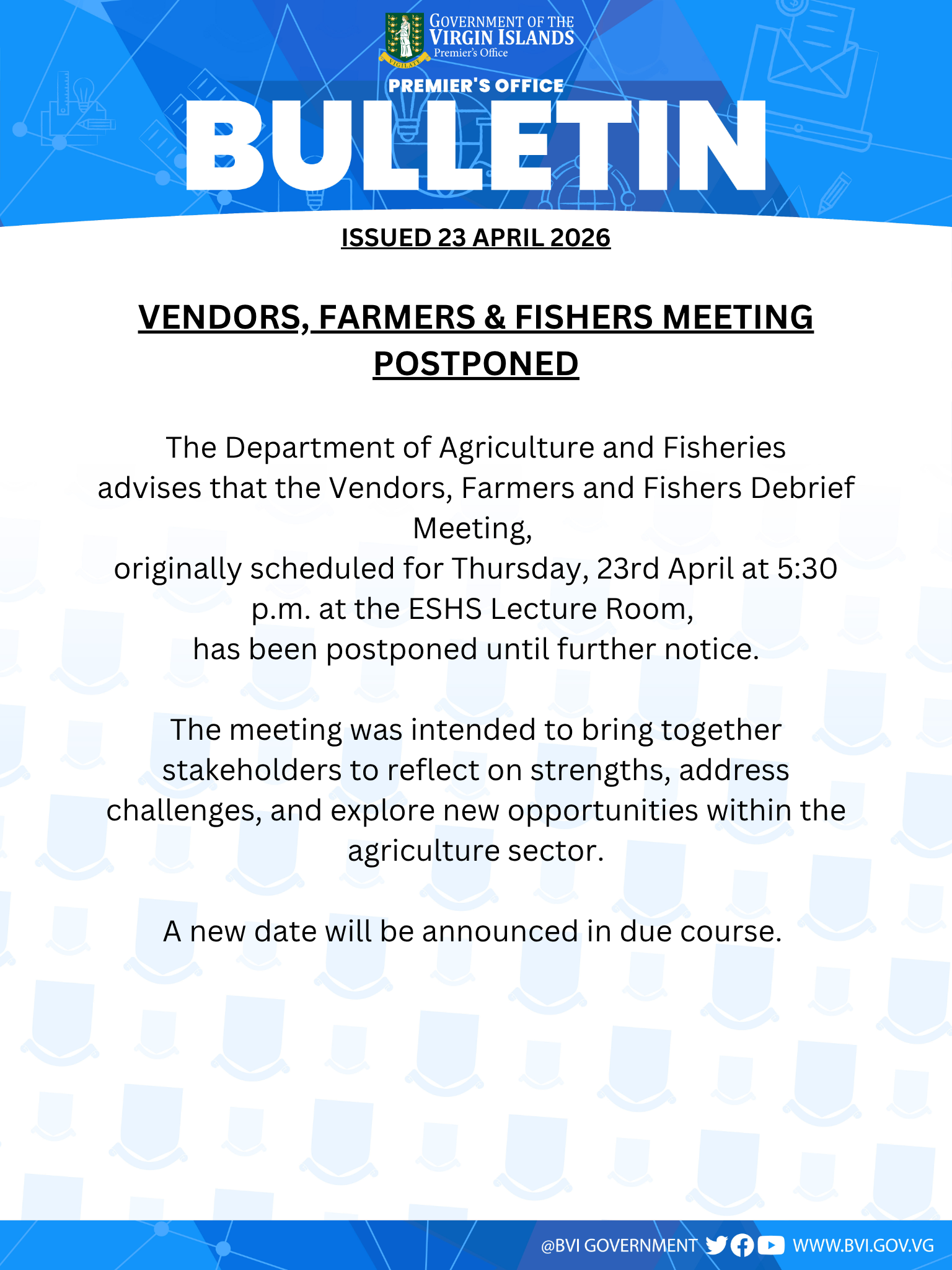 The Department of Agriculture and Fisheries advises that the Vendors, Farmers and Fishers Debrief Meeting, originally scheduled for Thursday, 23rd April at 5:30 p.m. at the ESHS Lecture Room, has been postponed until further notice.