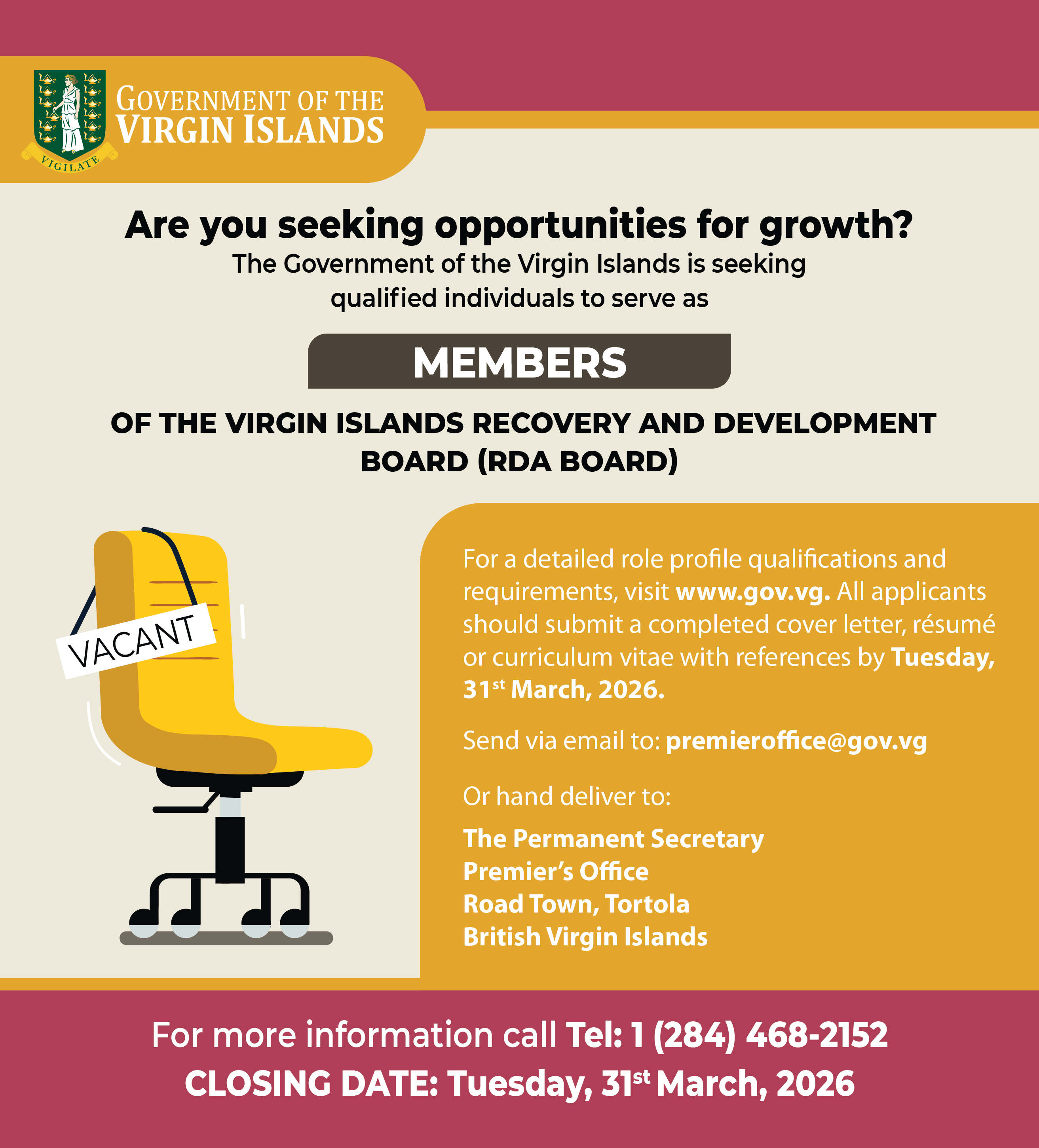 The Government of the Virgin Islands invites applications from suitably qualified and experienced individuals to serve as members of the Virgin Islands Recovery and Development Board (RDA Board), established under the Virgin Islands Recovery and Development Agency Act, 2018.