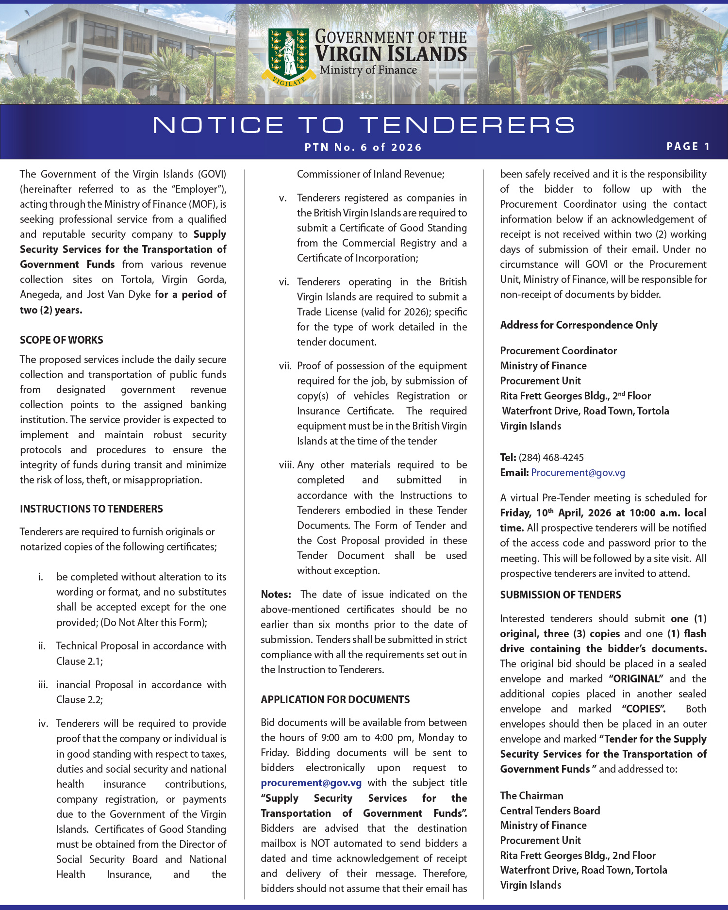Bidding documents will be sent to bidders electronically upon request to procurement@gov.vg with the subject title “Supply Security Services for the Transportation of Government Funds”.