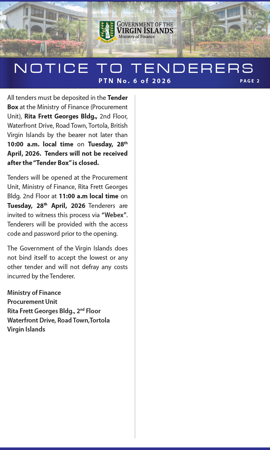 All tenders must be deposited in the tender box at the Ministry of Finance (Procurement Unit), Rita Frett Georges Bldg., 2nd Floor, Waterfront Drive, Road Town, Tortola, British Virgin Islands by the bearer not later than 10:00 a.m. local time on Tuesday, 28th April, 2026. Tenders will not be received after the “tender box” is closed.