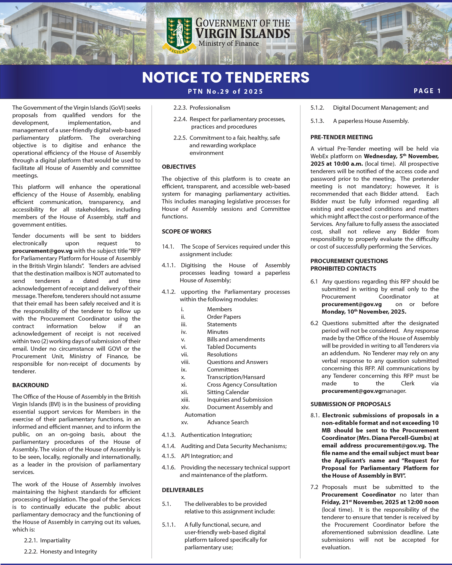 The Government of the Virgin Islands is inviting qualified vendors to submit proposals for the development, implementation, and management of a secure, user‑friendly web‑based parliamentary platform for the House of Assembly.