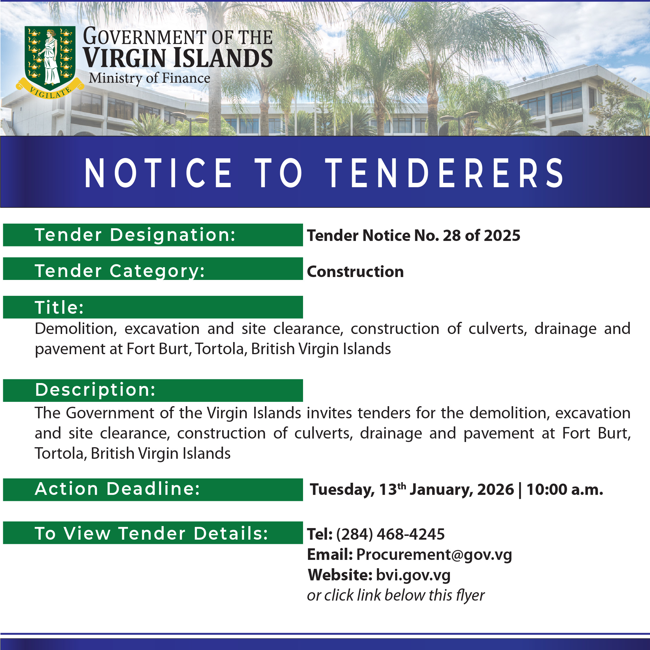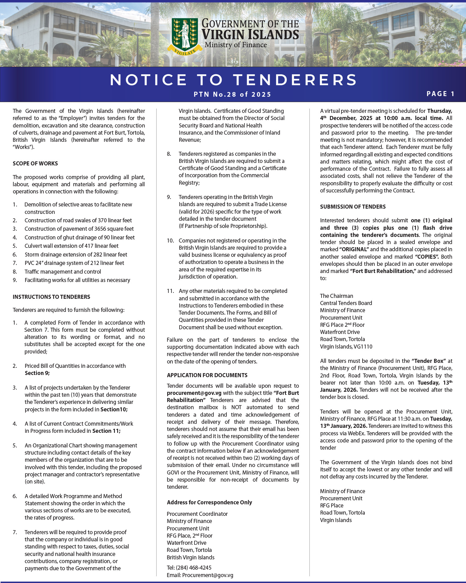 Tender documents are available upon request via email to procurement@gov.vg with the subject line “Fort Burt Rehabilitation.” A virtual pre-tender meeting will be held on Thursday, 4th December 2025 at 10:00 a.m. local time. While not mandatory, attendance is encouraged to ensure full understanding of the project scope and site conditions.