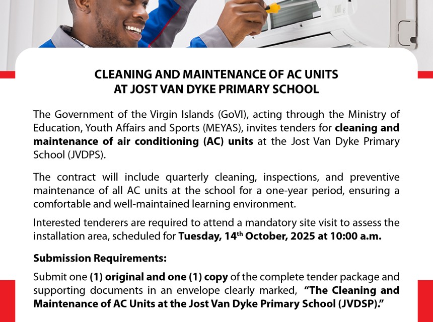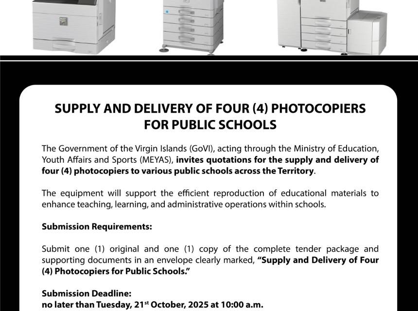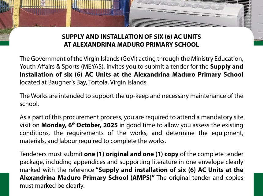 The Government of the Virgin Islands, through the Ministry of Education, Youth Affairs and Sports, is inviting tenders for the supply and delivery of two
