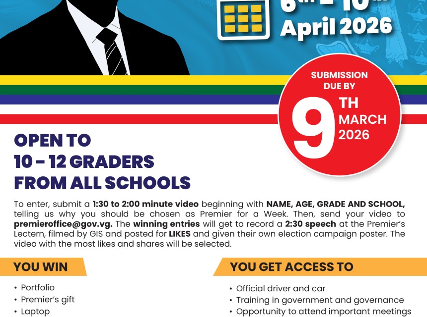 Ready to lead? 🇻🇬 The Office of the Premier is looking for a 10th to 12th grader to be Premier for a Week! Submit a More ...
