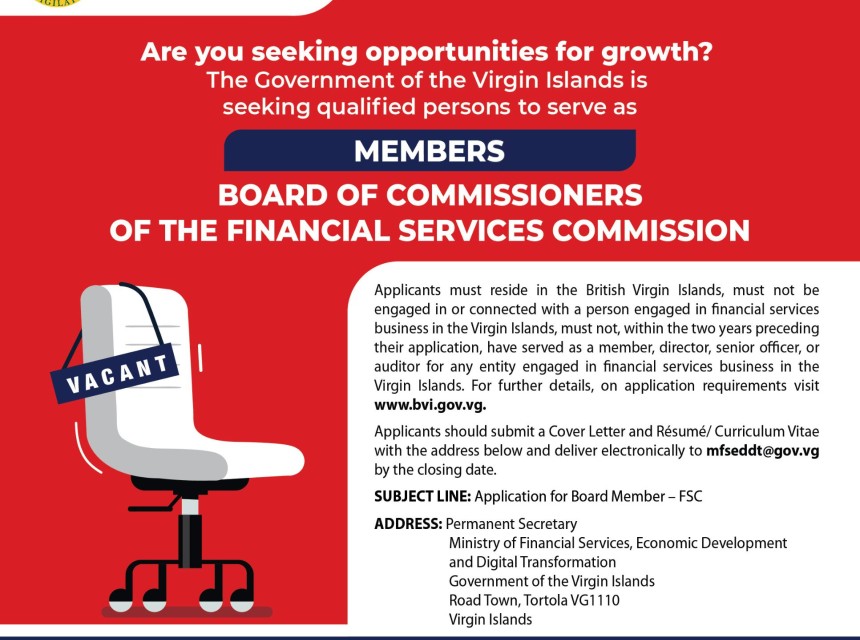 The Government of the Virgin Islands is seeking two qualified individuals to fill the following position: Member of the Board of Commissioners of the Financial