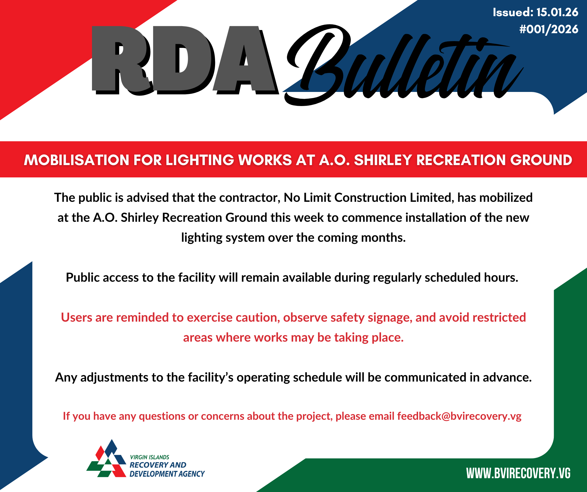 The public is advised that the contractor, No Limit Construction Limited, has mobilized at the A.O. Shirley Recreation Ground this week to commence installation of the new lighting system over the coming months.