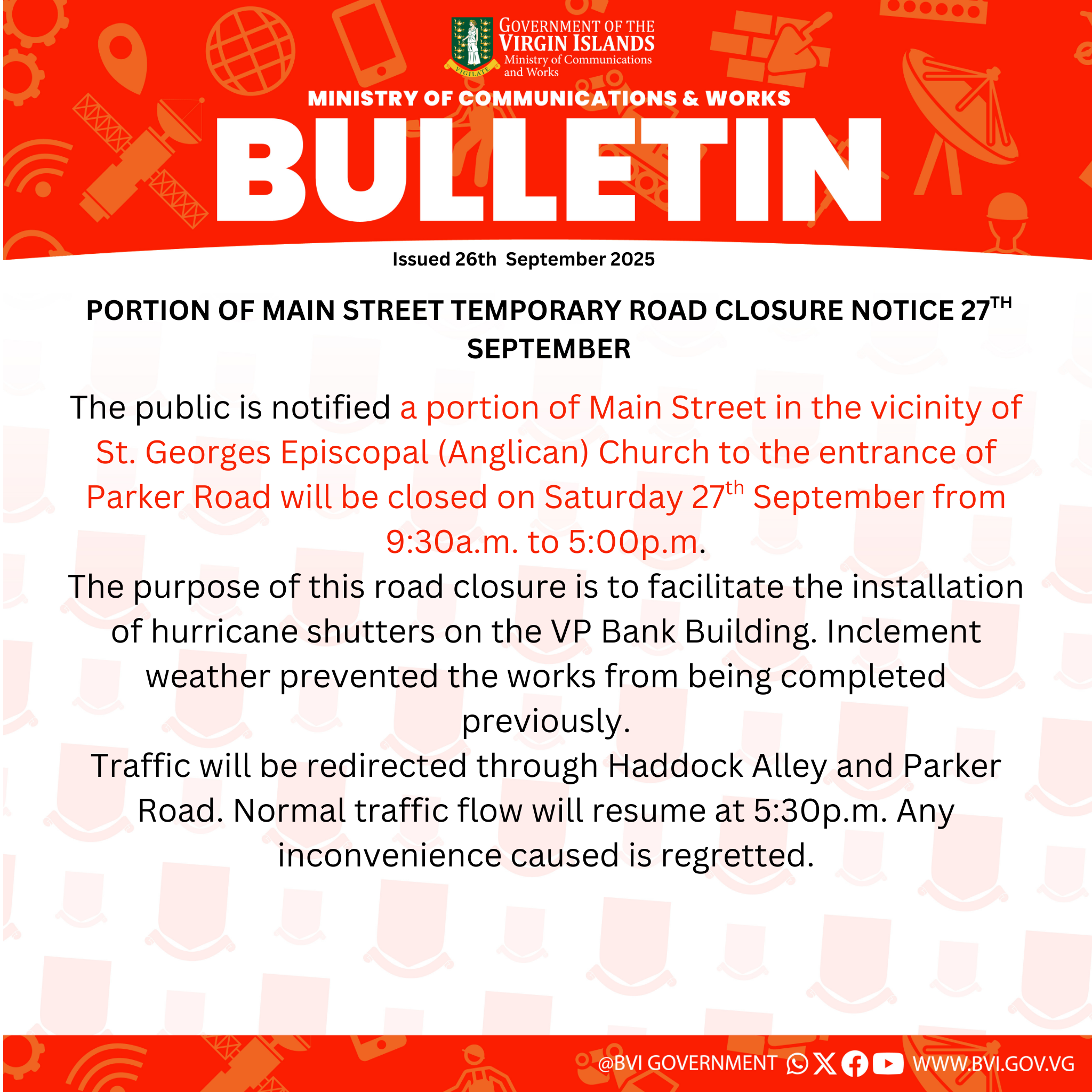 The purpose of this road closure is to facilitate the installation of hurricane shutters on the VP Bank Building. Inclement weather prevented the works from being completed previously.