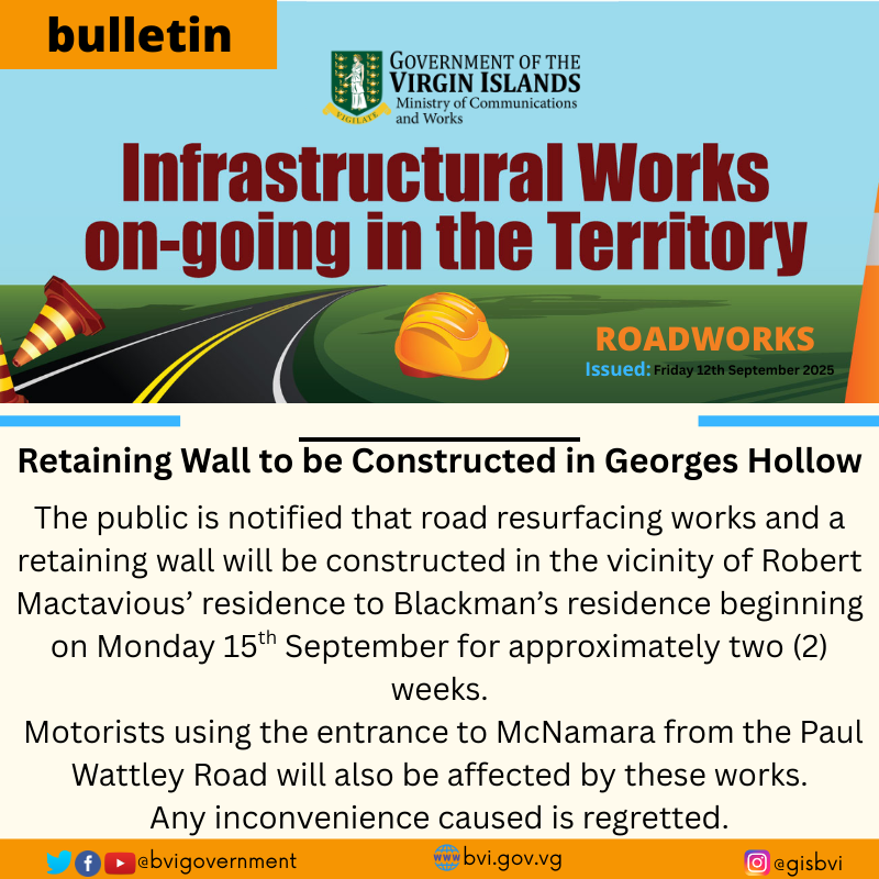 The public is notified that road resurfacing works and a retaining wall will be constructed in the vicinity of Robert Mactavious’ residence to Blackman’s residence beginning on Monday 15th September for approximately two (2) weeks.