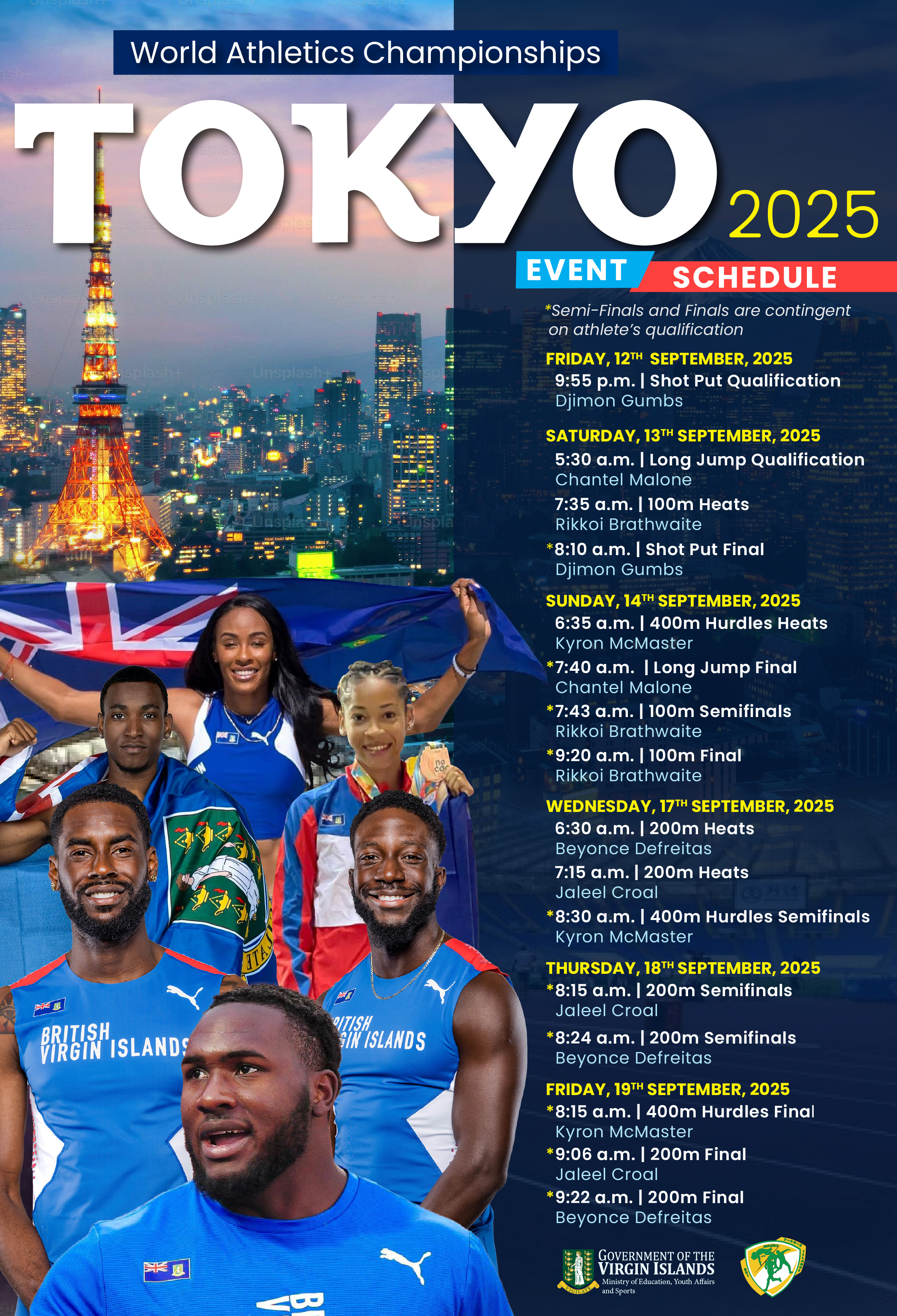 Minister for Education, Youth Affairs and Sports Honourable Sharie de Castro stated that this is a proud and historic moment for the Virgin Islands. “To have six of our athletes qualify for the World Athletics Championships is a true testament to their hard work, resilience, and world-class talent. Five of the six athletes have benefited from annual funding in support of their training and development through the Ministry’s Elite Althete Programme since 2024. Their achievements inspire not only our youth but the entire Territory, and we stand firmly behind them as they represent us in Tokyo.”