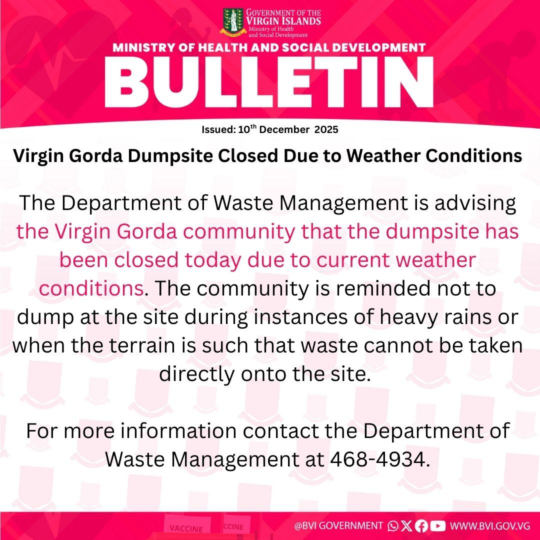The Department of Waste Management is advising the Virgin Gorda community that the dumpsite has been closed today due to current weather conditions.  The community is reminded not to dump at the site during instances of heavy rains or when the terrain is such that waste cannot be taken directly onto the site.