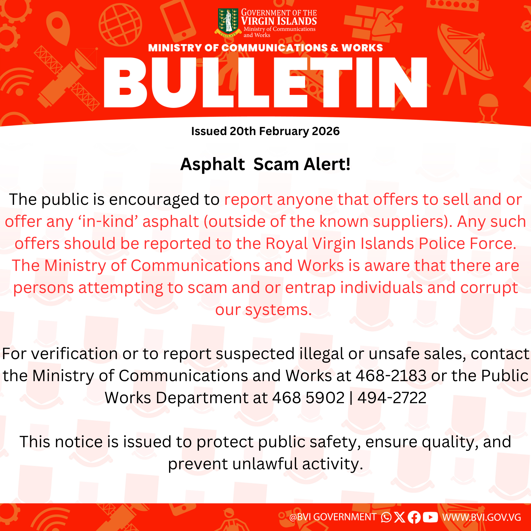 The public is encouraged to report anyone that offers to sell and or offer any ‘in-kind’ asphalt (outside of the known suppliers). Any such offers should be reported to the Royal Virgin Islands Police Force. The Ministry of Communications and Works is aware that there are persons attempting to scam and or entrap individuals and corrupt our systems.