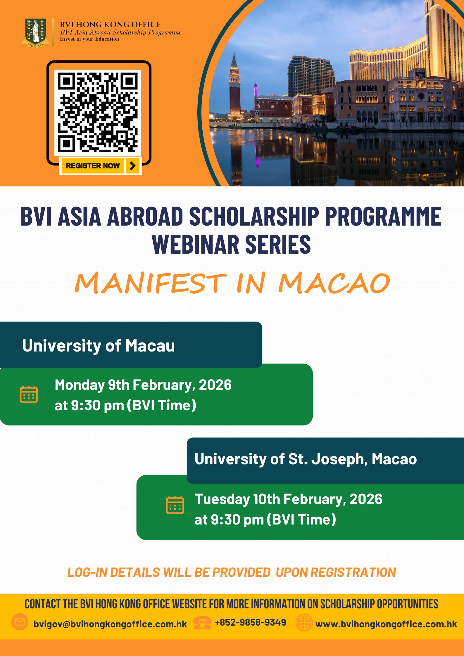 The BVI Hong Kong Office is hosting the "Manifest in Macao" webinar series! Learn about incredible scholarship opportunities at world-class institutions in Macao.
