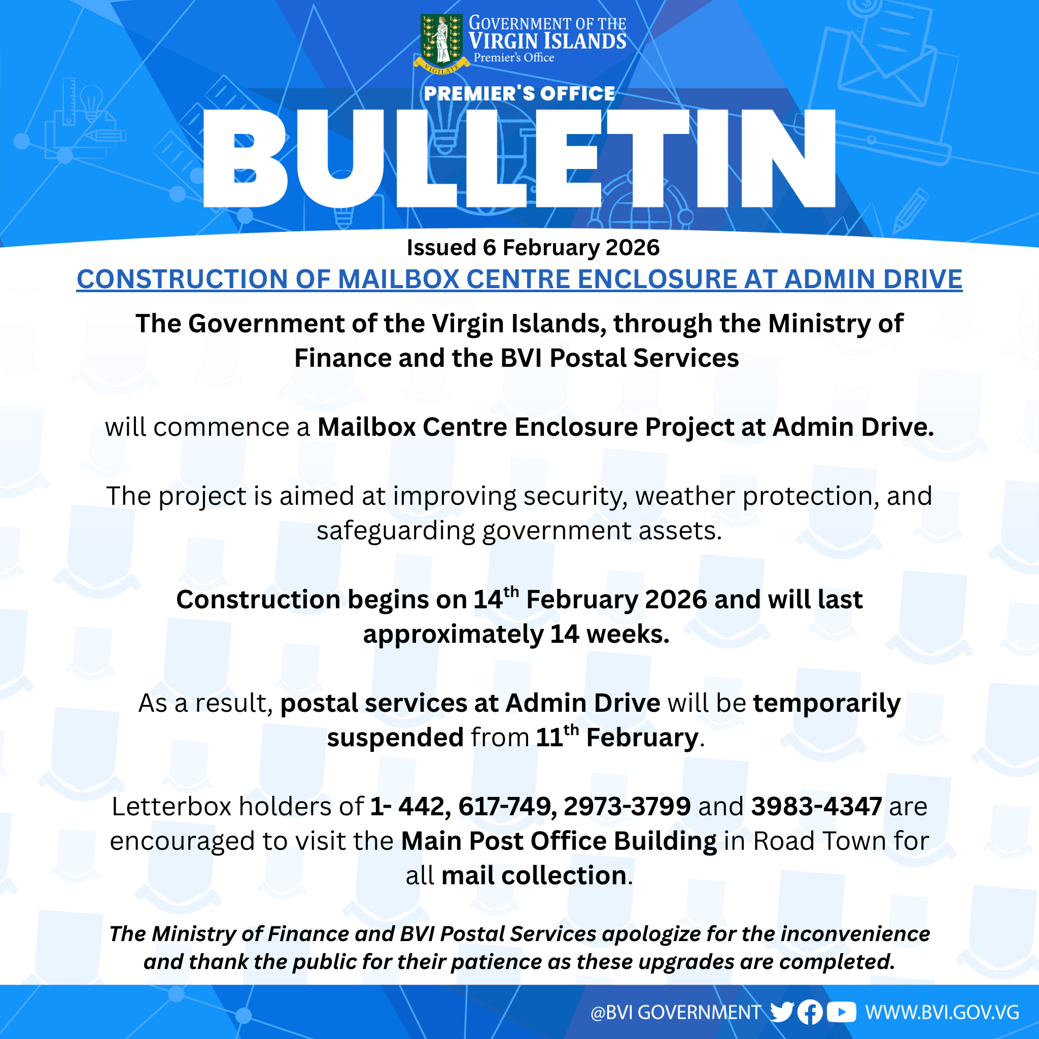 The Government of the Virgin Islands, through the Ministry of Finance and the BVI Postal Services will commence a Mailbox Centre Enclosure Project at Admin Drive.