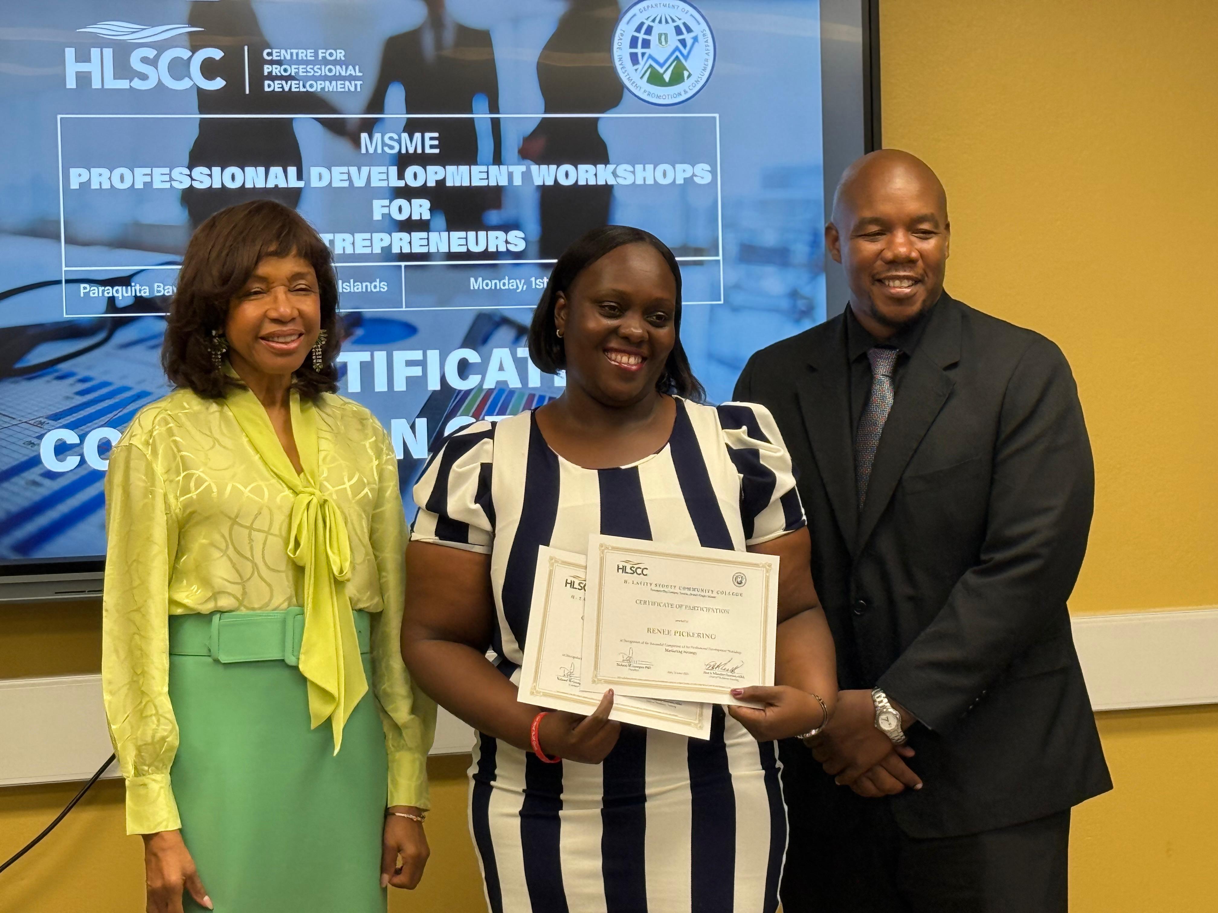 In attendance were Honourable Lorna G. Smith, OBE, Minister for Financial Services, Economic Development and Digital Transformation, Deputy Director of the Department of Trade and Investment Promotion, Dr. Lincoln Bobb, HLSCC Vice President of Academic Affairs, Dr. Ronald Brunson, Business Development Manager of the National Business Bureau, Mr. Leroy James, programme instructors and 12 of the 20 awardees.