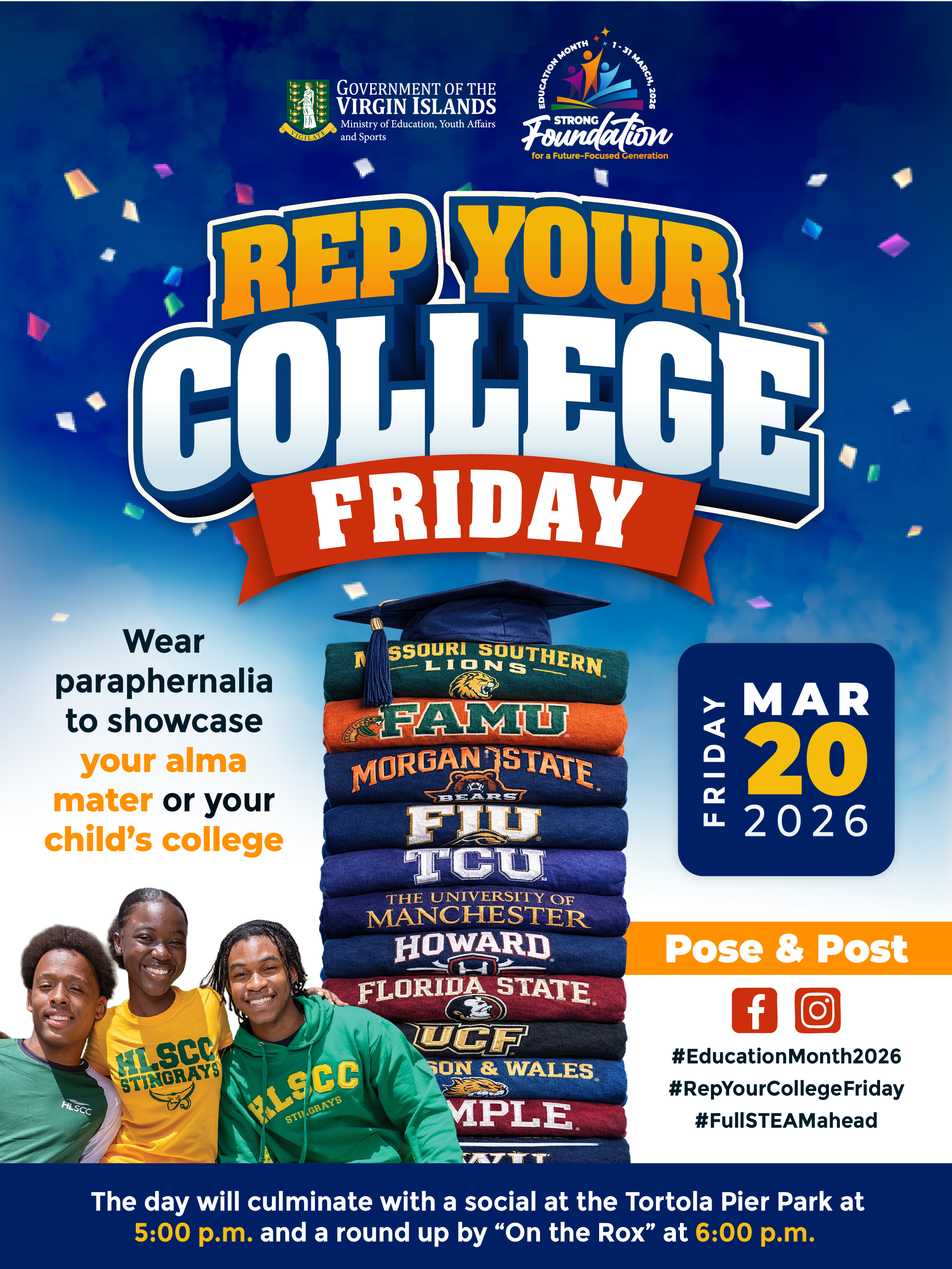 Also on Friday, 20th March, schools across the Territory will host Open House activities, and the public is encouraged to participate in “Rep Your College Friday” by wearing apparel representing their alma mater or their child’s college or university.