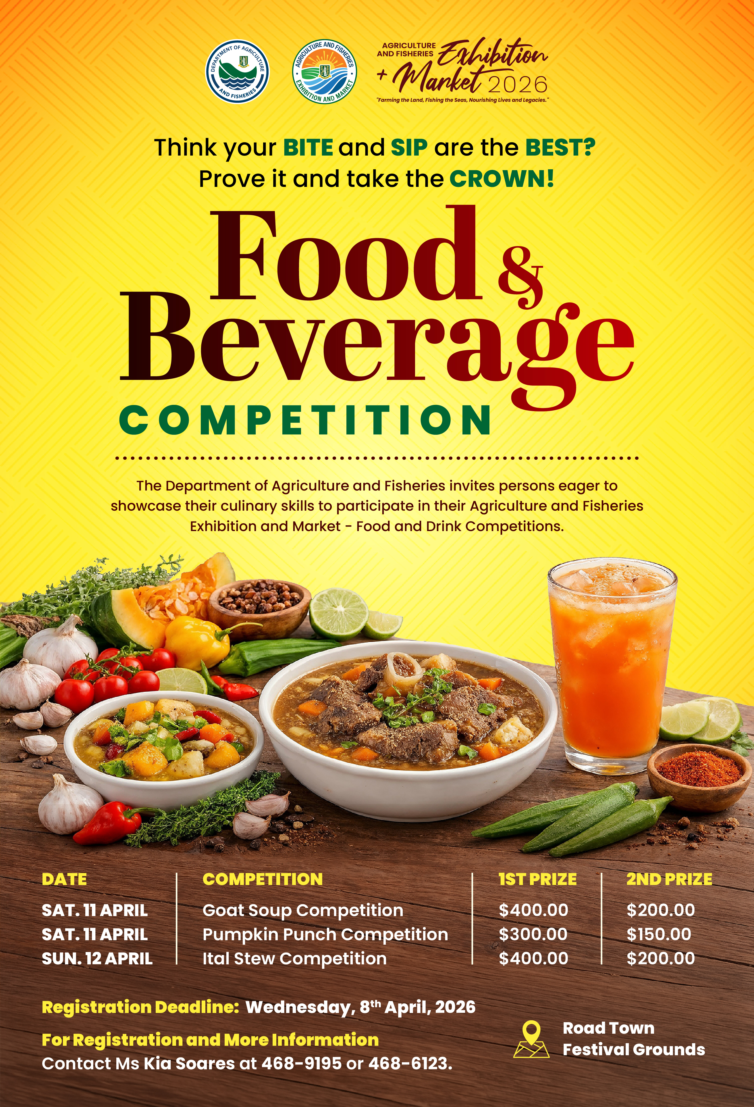 Whether you’re confident your bite or sip is the best, this is your opportunity to prove it and take the crown. Registration closes on Wednesday, 8th April 2026. The competition will be held at the Road Town Festival Grounds.