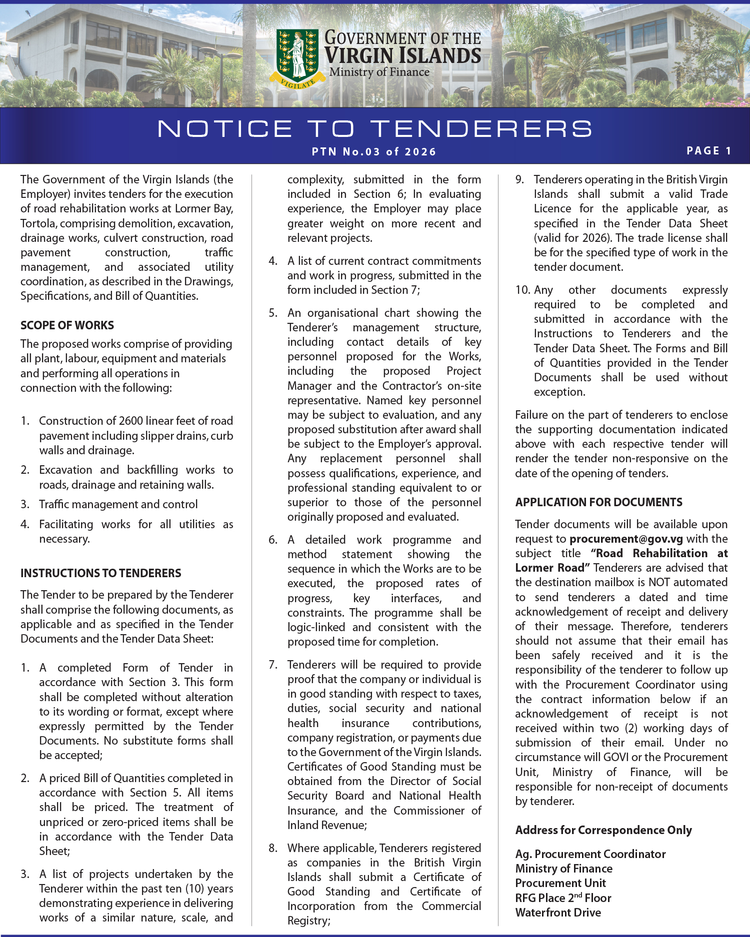 The Government of the Virgin Islands invites tenders for the execution of road rehabilitation works at Lomer Bay, Tortola.