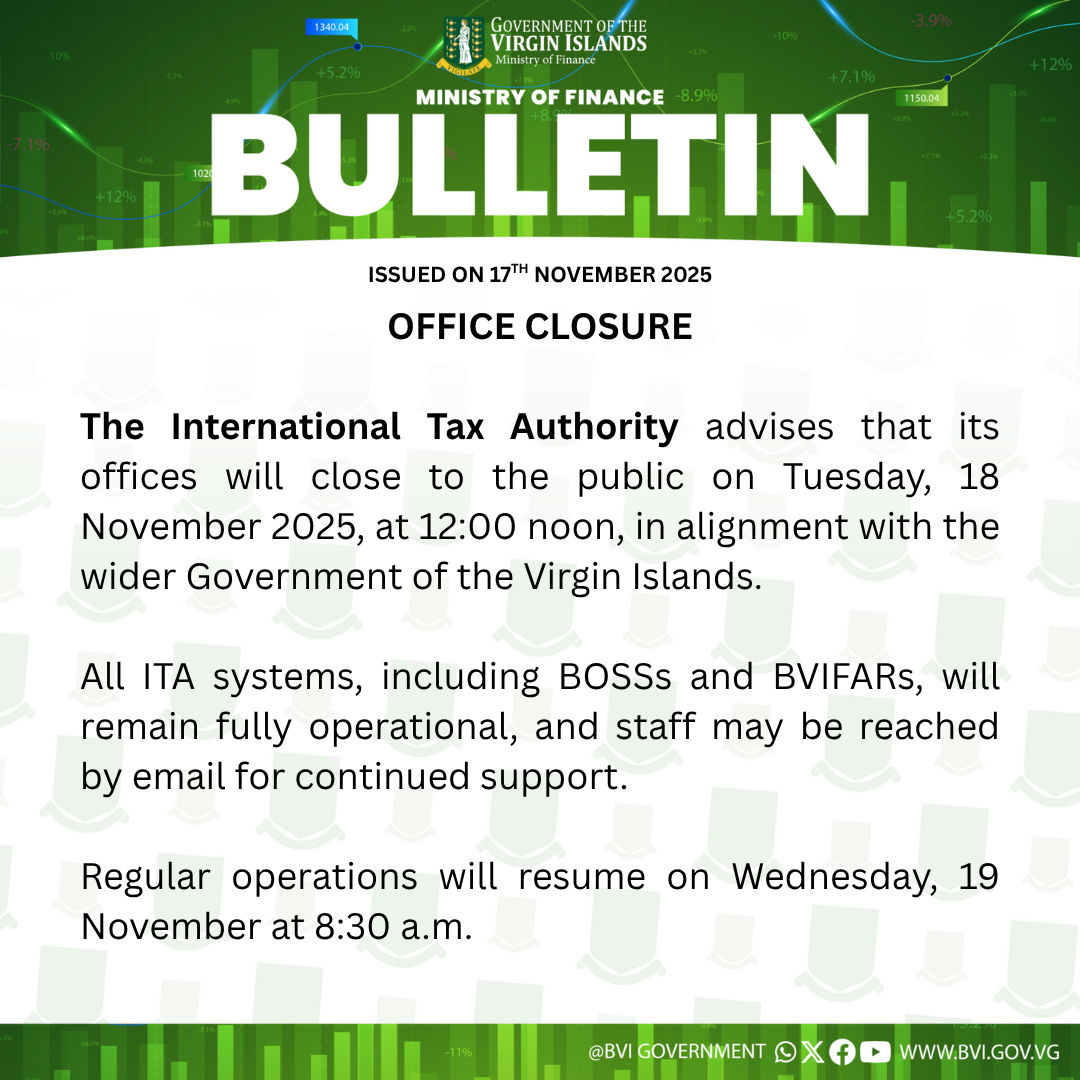 The International Tax Authority advises that its offices will close to the public on Tuesday, 18 November 2025, at 12:00 noon, in alignment with the wider Government of the Virgin Islands.