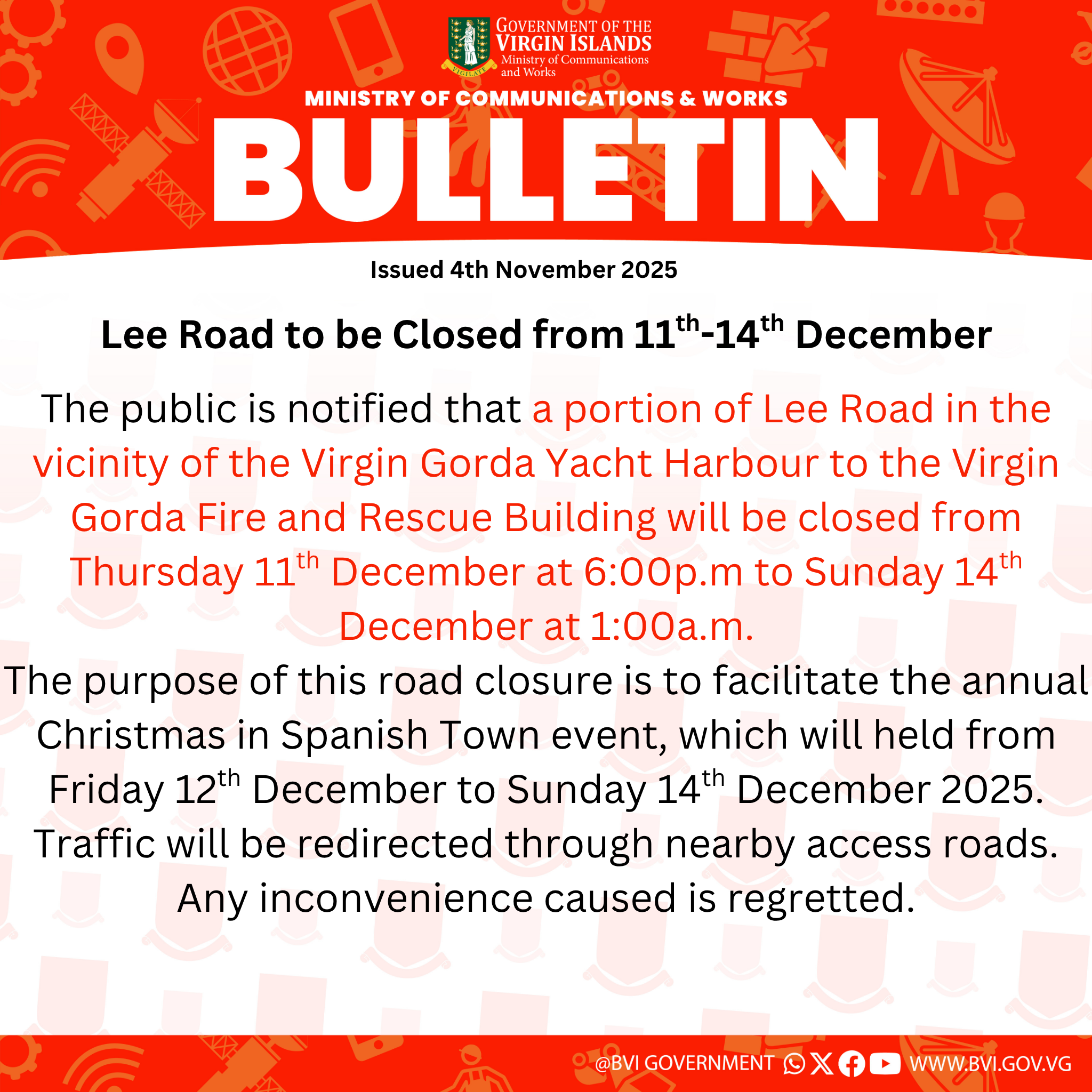 The public is notified that a portion of Lee Road in the vicinity of the Virgin Gorda Yacht Harbour to the Virgin Gorda Fire and Rescue Building will be closed from Thursday 11th December at 6:00p.m to Sunday 14th December at 1:00a.m.