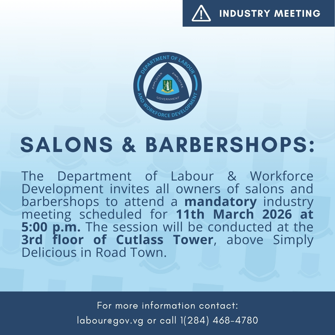 The Department of Labour & Workforce Development invites all owners of salons and barbershops to attend a mandatory industry meeting scheduled for 11th March 2026 at 5:00 p.m. The session will be conducted at the 3rd floor of Cutlass Tower, above Simply Delicious in Road Town.