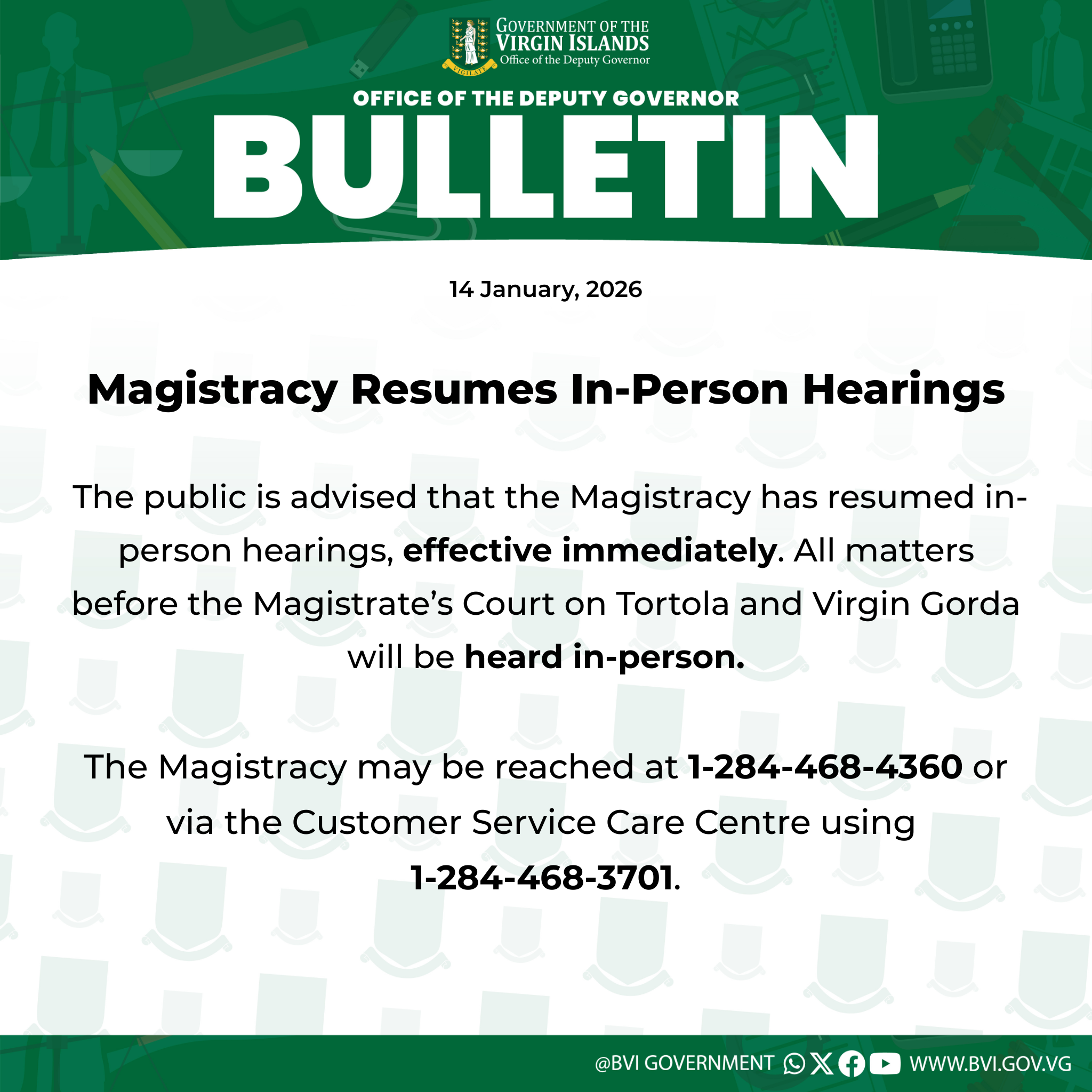 The public is advised that the Magistracy has resumed in-person hearings, effective immediately. All matters before the Magistrate’s Court on Tortola and Virgin Gorda will be heard in-person.
