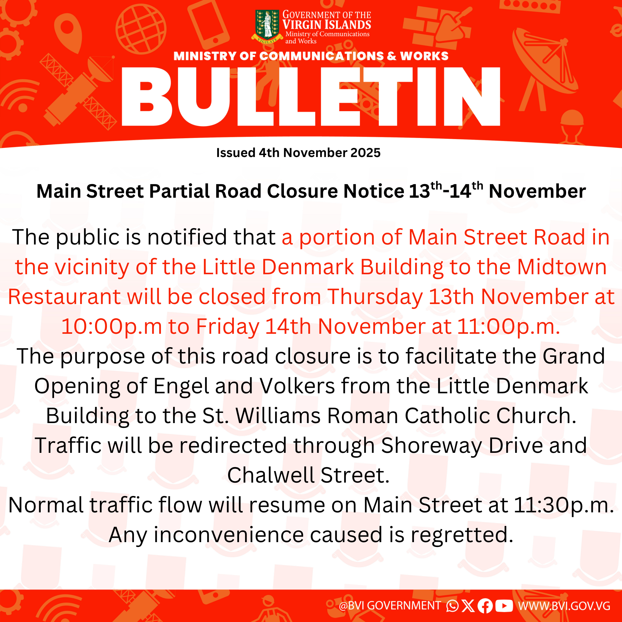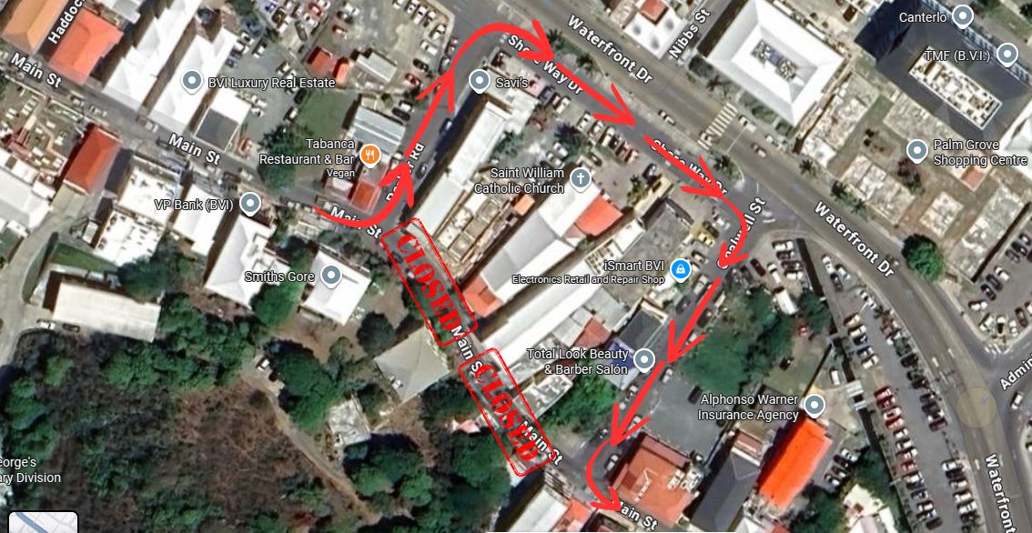 The public is notified that a portion of Main Street Road in the vicinity of the Little Denmark Building to the Midtown Restaurant will be closed from Thursday 13th November at 10:00p.m to Friday 14th November at 11:00p.m.