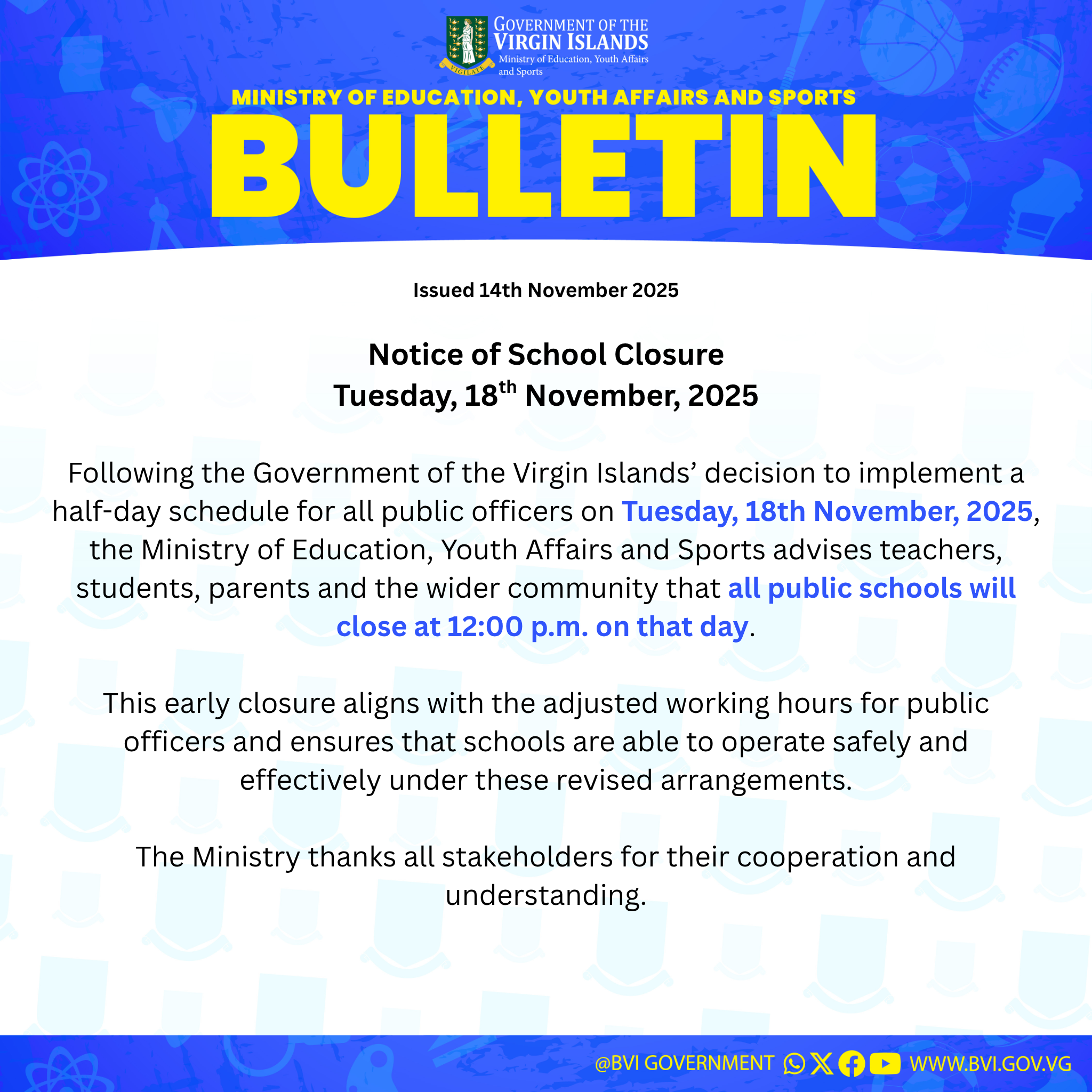 Following the Government of the Virgin Islands’ decision to implement a half-day schedule for all public officers on Tuesday, 18th November, 2025, the Ministry of Education, Youth Affairs and Sports advises teachers, students, parents and the wider community that all public schools will close at 12:00 p.m. on that day.