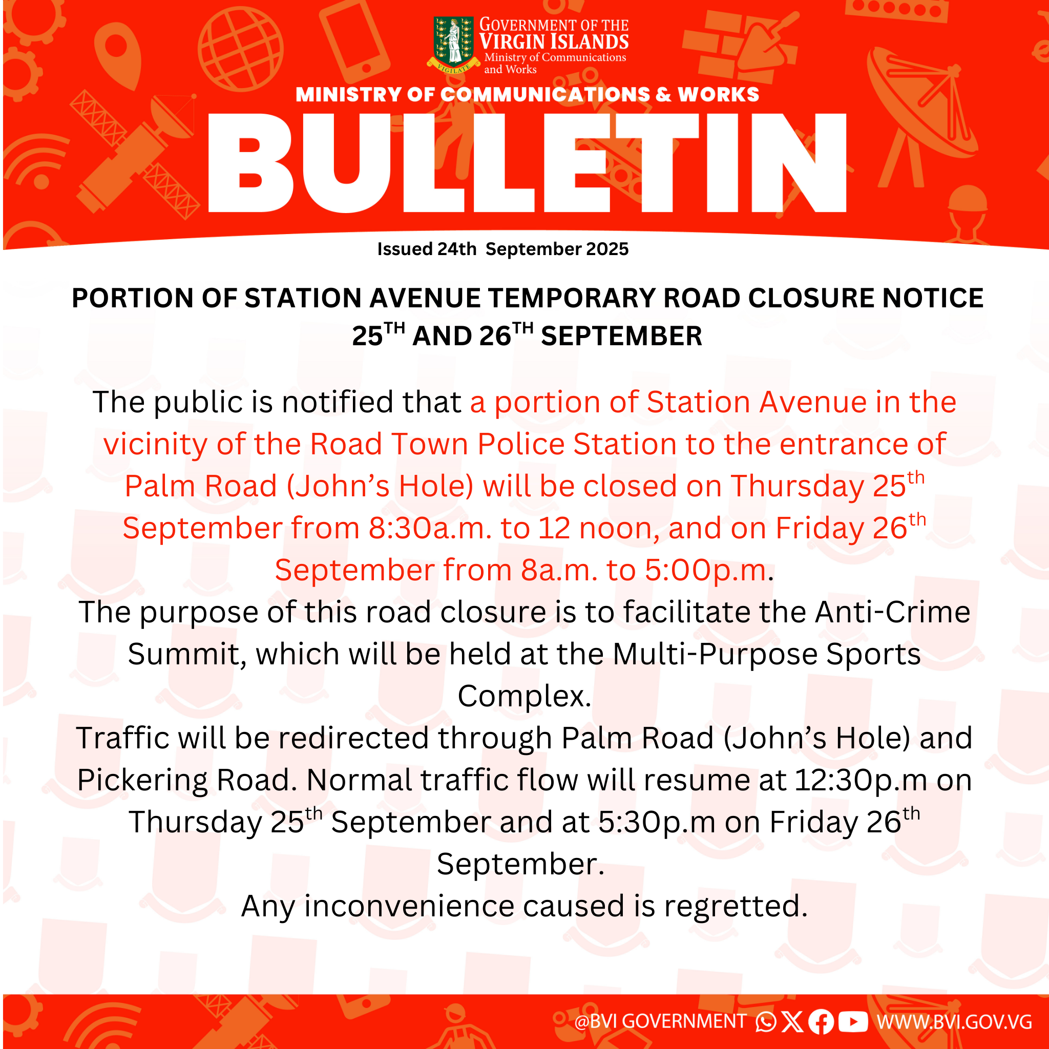 The public is notified that a portion of Station Avenue in the vicinity of the Road Town Police Station to the entrance of Palm Road (John’s Hole) will be closed on Thursday 25th September from 8:30a.m. to 12 noon, and on Friday 26th September from 8a.m. to 5:00p.m.