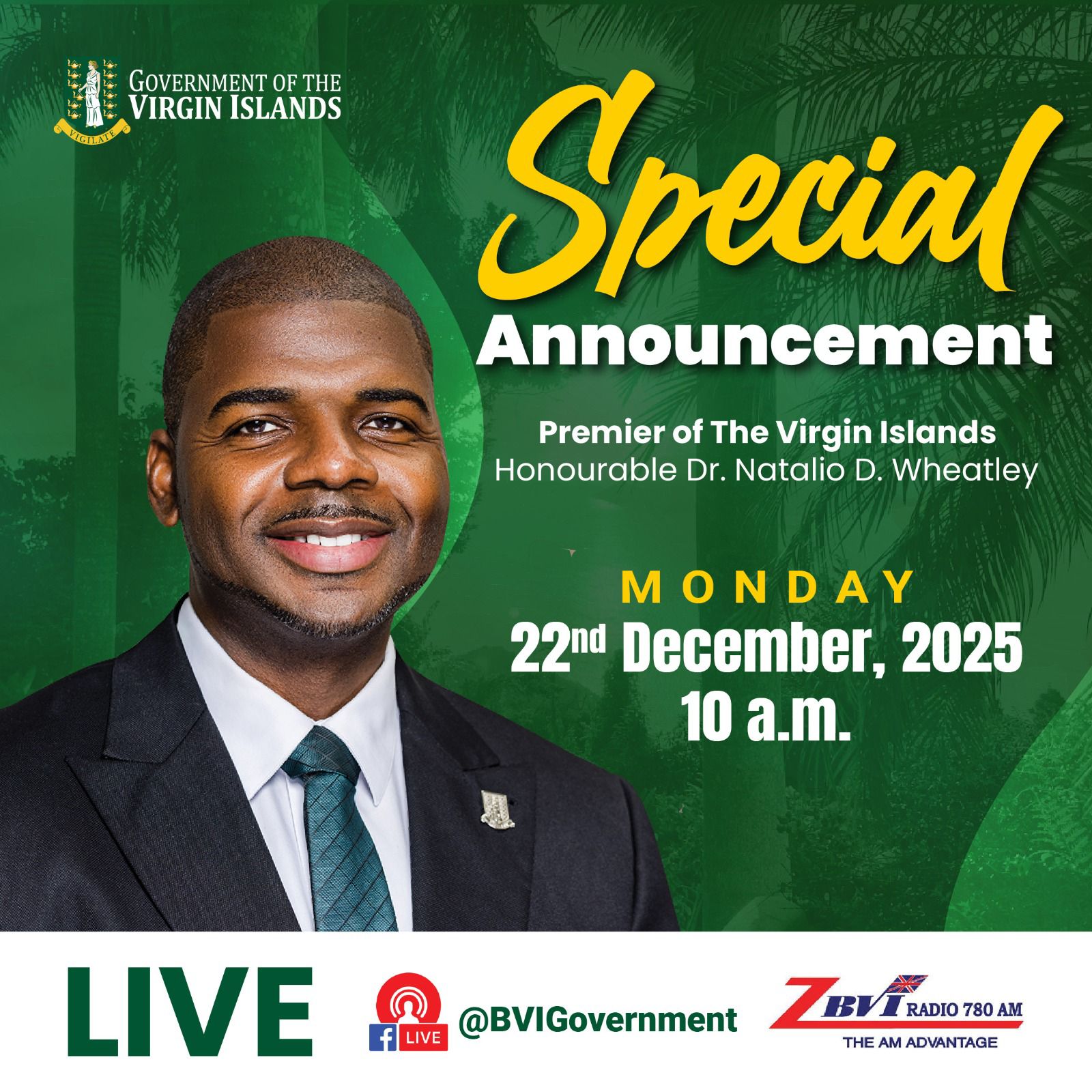 The Premier of the Virgin Islands, Honourable Dr. Natalio D. Wheatley, will deliver a special announcement on Monday, 22nd December 2025, at 10:00 a.m.