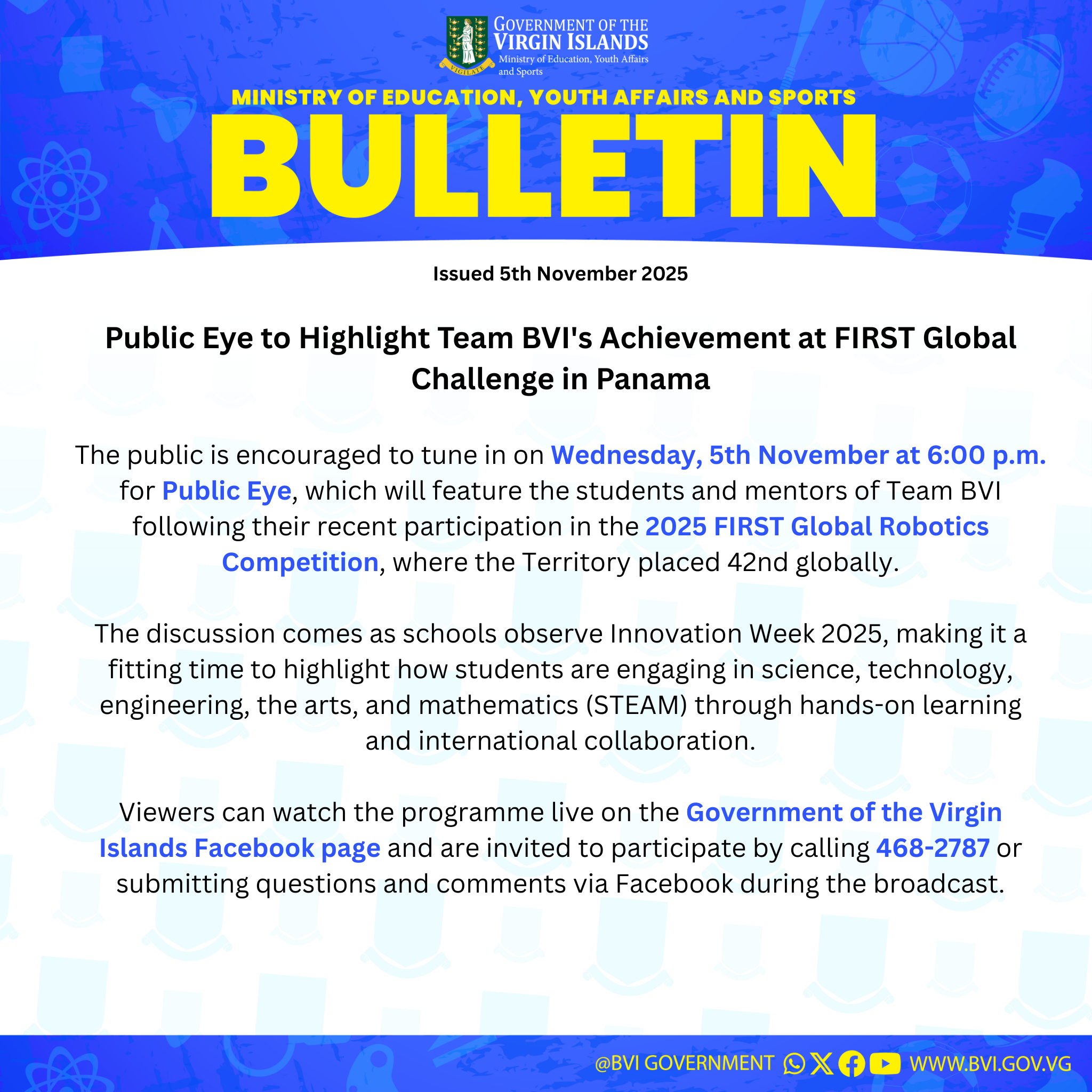 The public is encouraged to tune in on Wednesday, 5th November at 6:00 p.m. for Public Eye, which will feature the students and mentors of Team BVI following their recent participation in the 2025 FIRST Global Robotics Competition, where the Territory placed 42nd globally.