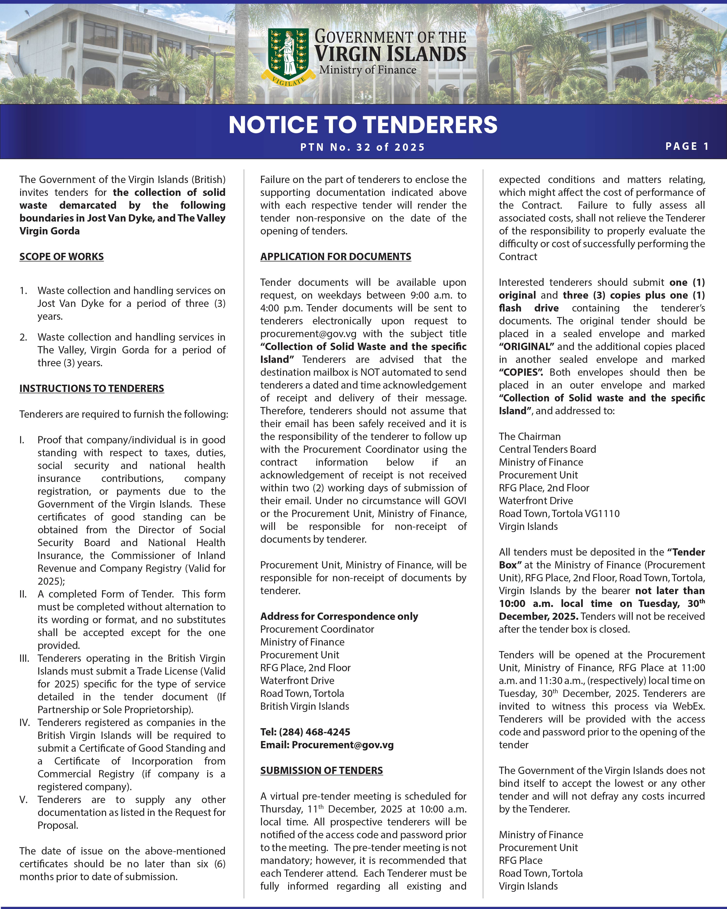 Tender documents are available electronically upon request to procurement@gov.vg. A virtual pre-tender meeting will be held on Thursday, 11th December 2025 at 10:00 a.m. local time. Completed tenders must be submitted to the Ministry of Finance, Procurement Unit, RFG Place, Road Town, Tortola, no later than 10:00 a.m. on Tuesday, 30th December 2025.